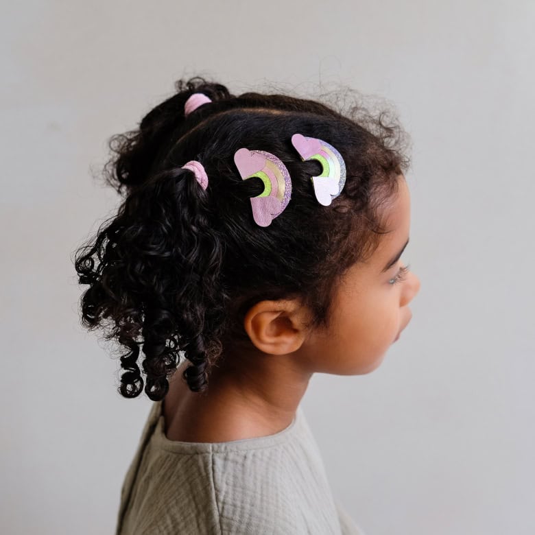 Um par de ganchos de cabelo rosa-arco-íris brilhantes, simplesmente deslumbrantes – perfeitas para espalhar um pouco de magia por onde passarem!