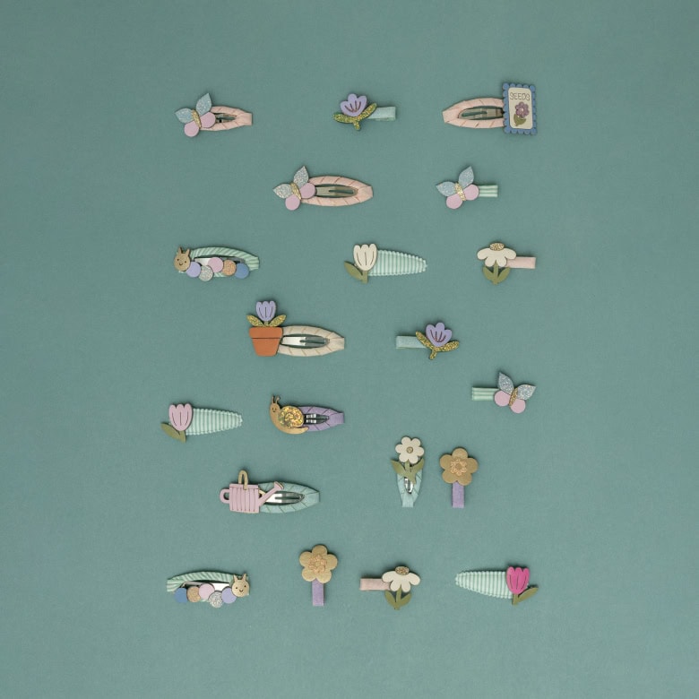 Decore o cabelo das meninas com estas mini tulipas! Cada presilha é revestida com um tecido macio e listrado – perfeito para domar os fios rebeldes!