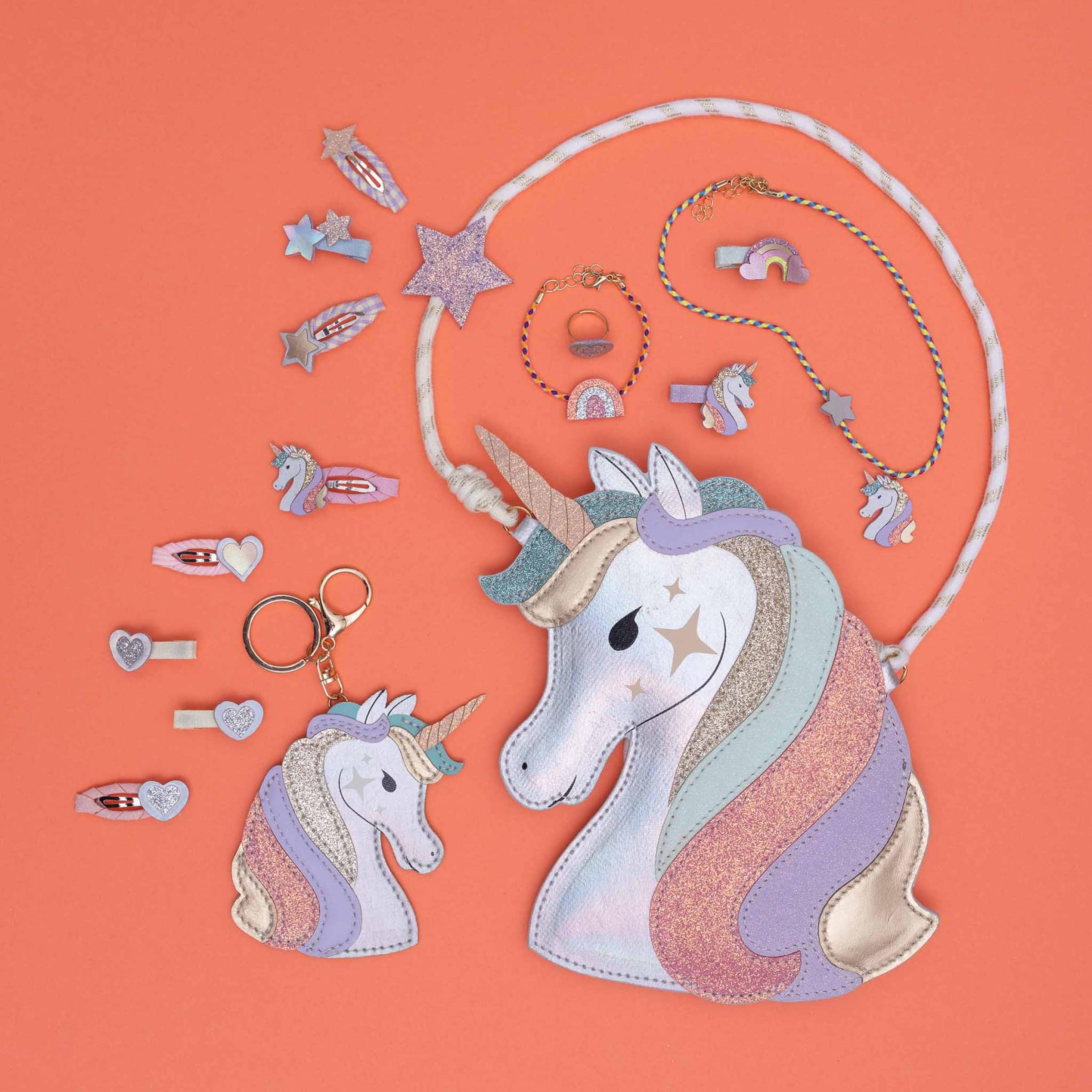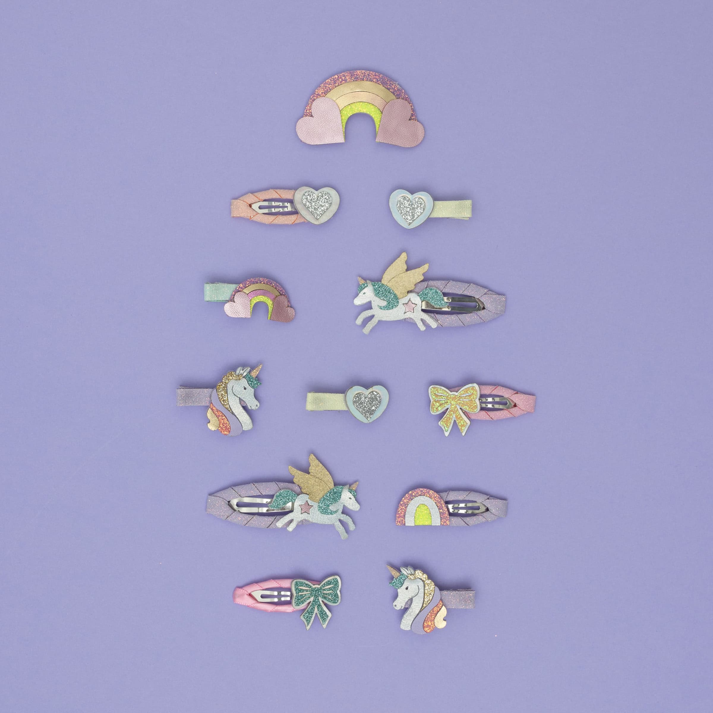 - Mini presilhas de cabelo de 4 cm, envoltas em fita e adornadas com unicórnios, corações e estrelas, confeccionadas em uma linda mistura de camurça macia, glitter e tecidos metalizados.