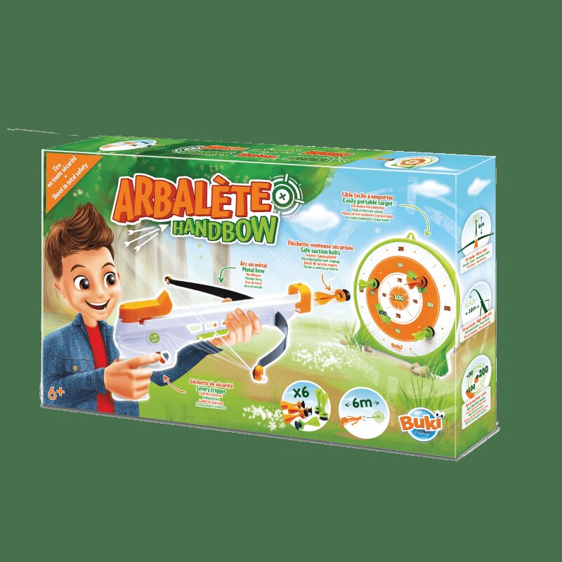 Um arco de mão para praticar tiro com total segurança: puxe o arco, carregue, mire e atire!Mecanismo desenhado por uma empresa especializada em tiro com arco: o mecanismo e os parafusos de sucção garantem uma utilização sem riscos!