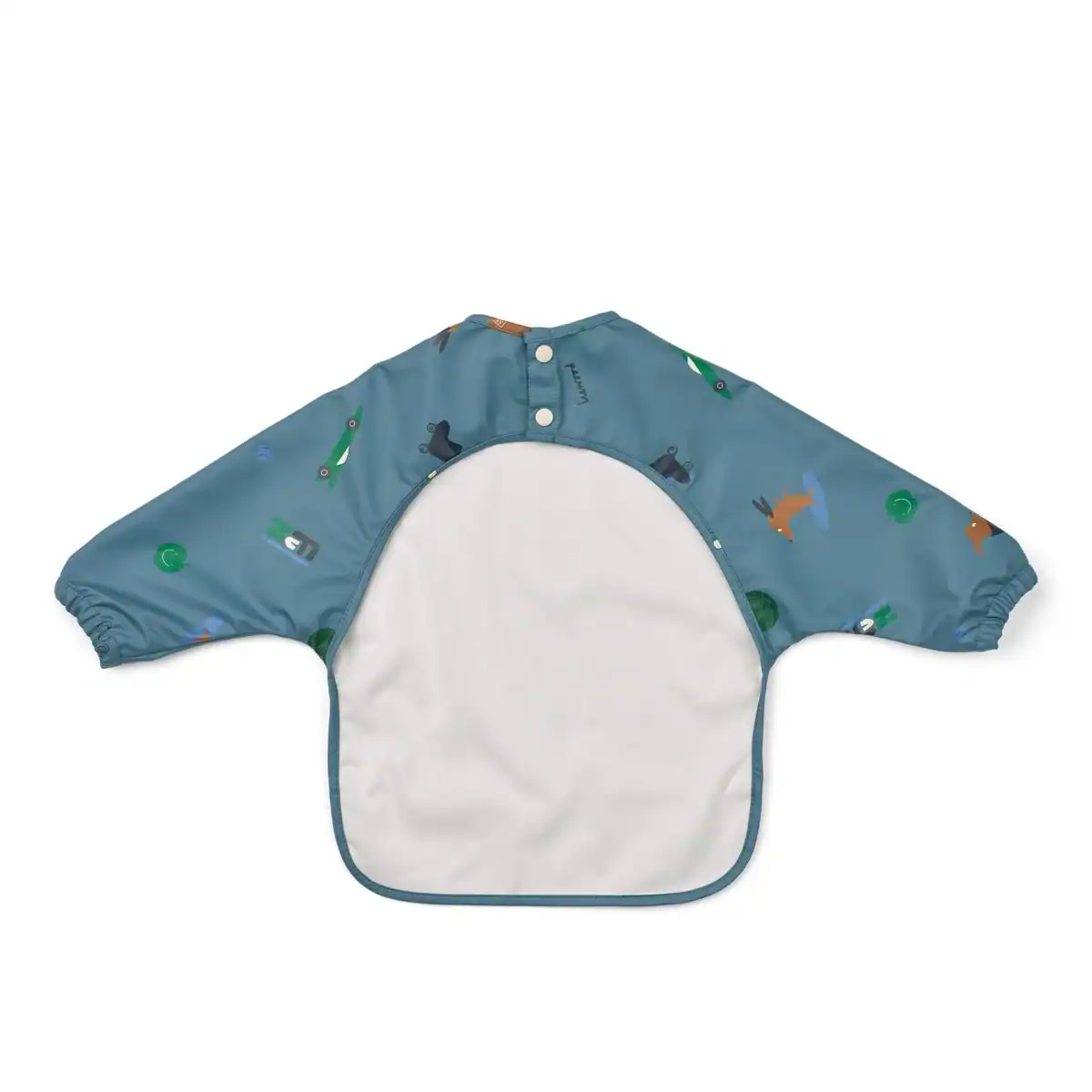 Babete com mangas para bebés e crianças pequenas que estão a aprender a comer sozinhas. Os punhos elásticos garantem um ajuste perfeito e o bolso frontal recolhe a comida que derrama. Feito de poliéster reciclado durável, o babete é fácil de limpar e pode ser dobrado para armazenamento compacto em casa ou em viagens.