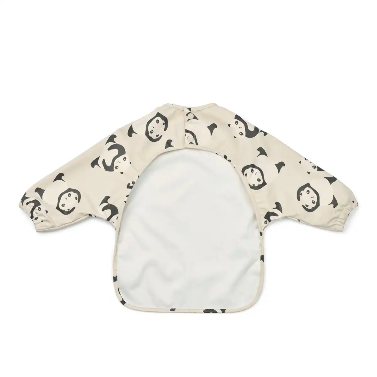 Babete com mangas para bebés e crianças pequenas que estão a aprender a comer sozinhas. Os punhos elásticos garantem um ajuste perfeito e o bolso frontal recolhe a comida que derrama. Feito de poliéster reciclado durável, o babete é fácil de limpar e pode ser dobrado para armazenamento compacto em casa ou em viagens.