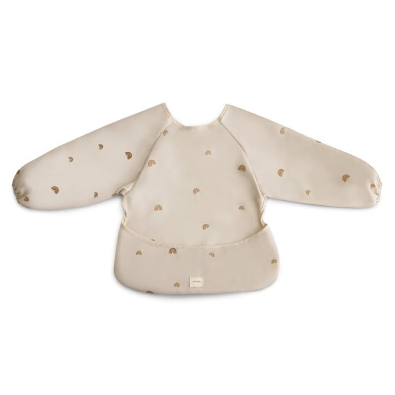 Babete de manga comprida da Mushie para refeições práticas. É resistente à água e possui um bolso grande que coleta facilmente os alimentos e evita que eles caiam no chão ou na roupa. O babete possui um fecho de velcro na parte de trás do pescoço para um ajuste confortável.