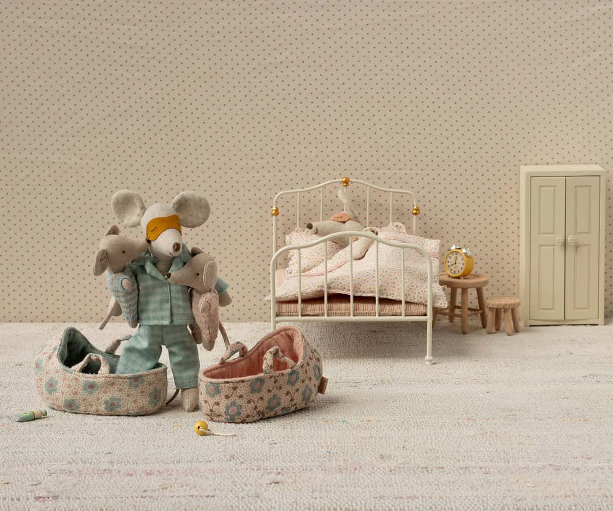 Um ratinho bebé num macacão de tricô macio e listrado. Dorme por horas em seu pequeno berço acolchoado.