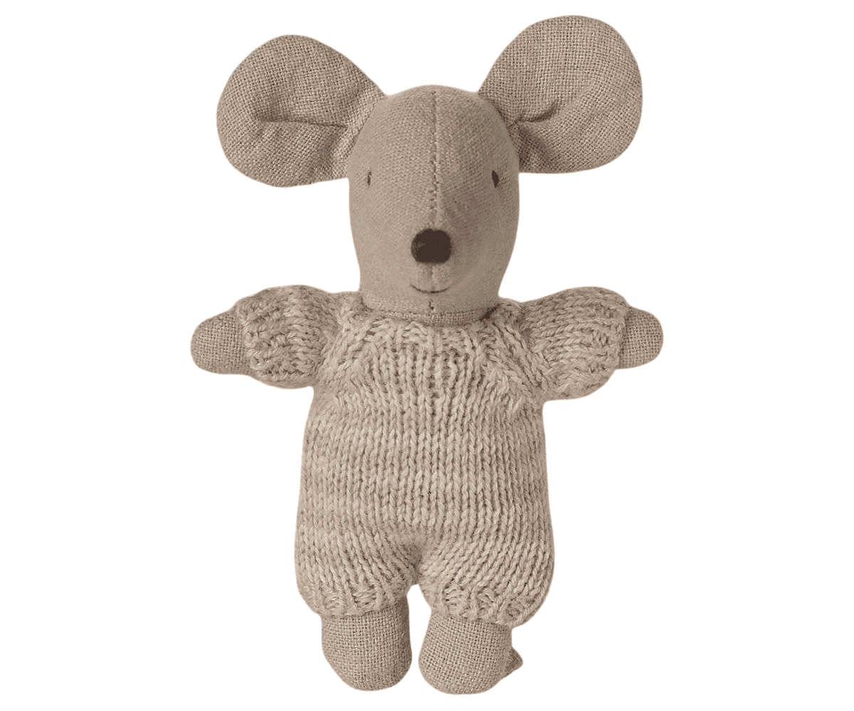 Um ratinho bebé com macacão de tricô macio e listrado. Dorme por horas no seu pequeno berço acolchoado.