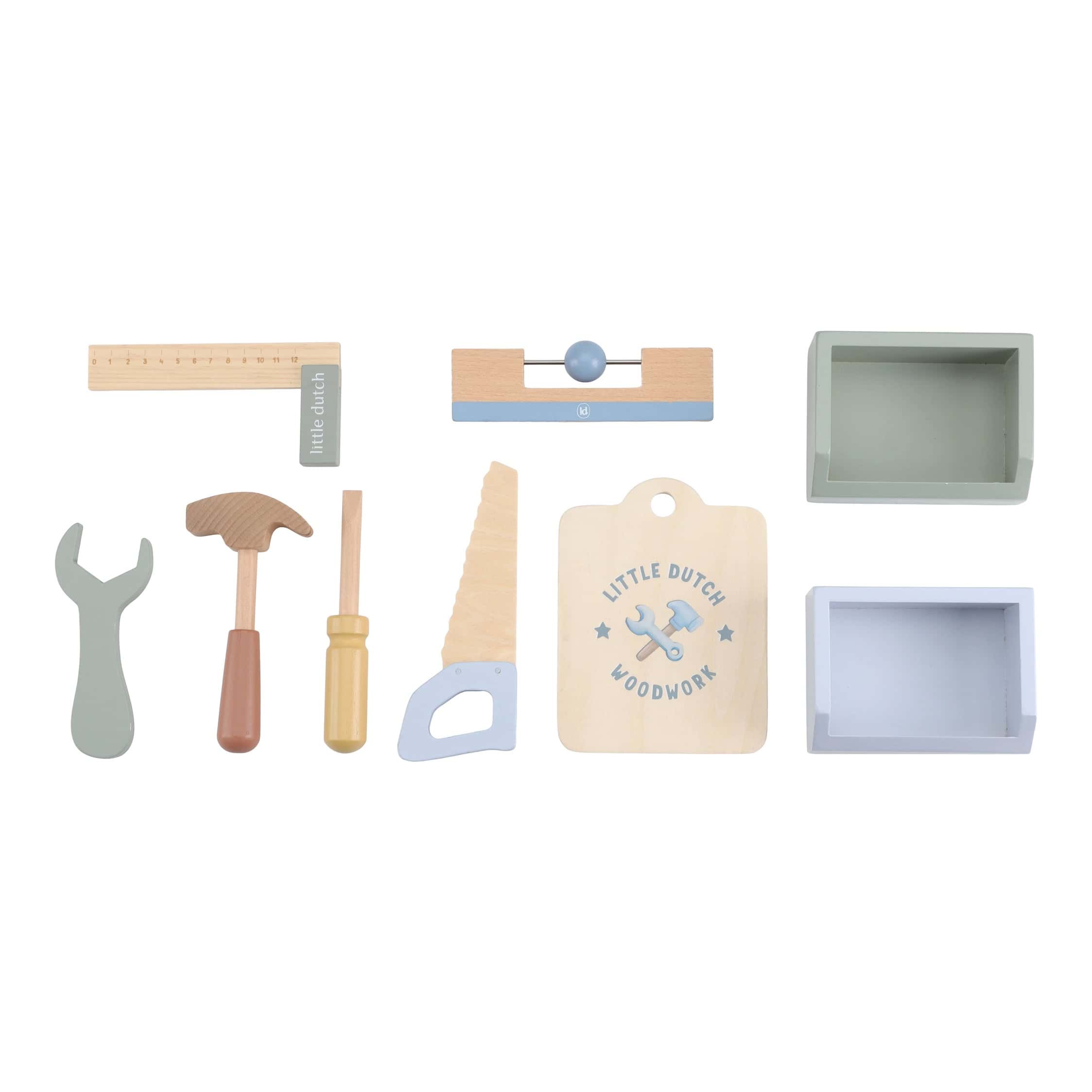 O conjunto inclui diversas ferramentas, como uma serra circular, e estimula a dramatização, as capacidades motoras e a criatividade.