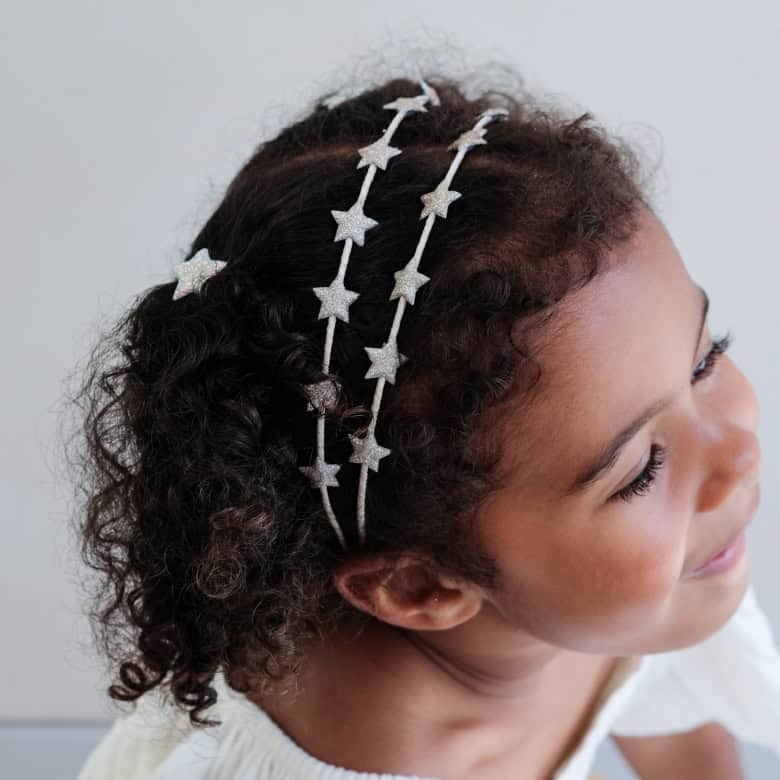 Bandolete coberta de estrelinhas brilhantes, este acessório divertido adiciona um toque divertido de brilho a qualquer penteado, perfeito para iluminar o dia com um toque de magia.Duas fileiras envoltas em fitas adornadas com estrelas acolchoadas feitas de um lindo tecido macio com glitter metálico.