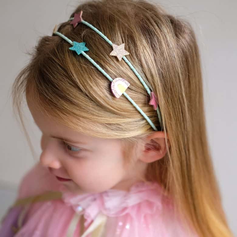 - Tiara de cabelo com fita, adornada com 6 estrelas acolchoadas e 2 arco-íris nos mais lindos tecidos metálicos e com glitter.