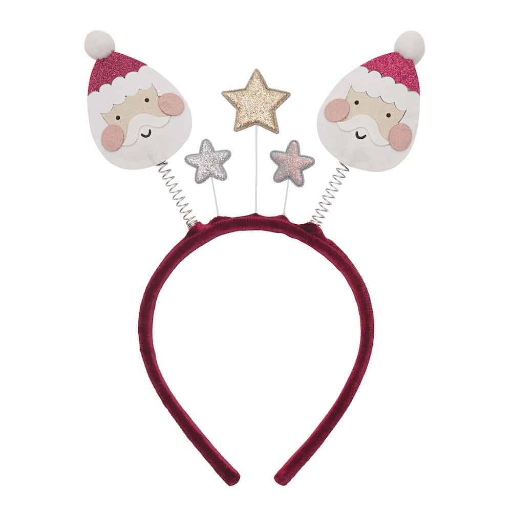 Dois rostinhos alegres do Pai Natal dançam sobre duas molas resistentes, criando um visual cheio de alegria natalina! A tiara, revestida em veludo bordô, é adornada com três estrelas de tecido brilhante no centro, além de duas molas resistentes com rostinhos alegres do Pai Natal em tecido, completos com gorros brilhantes e pompons minúsculos.