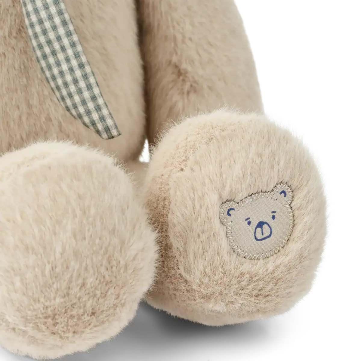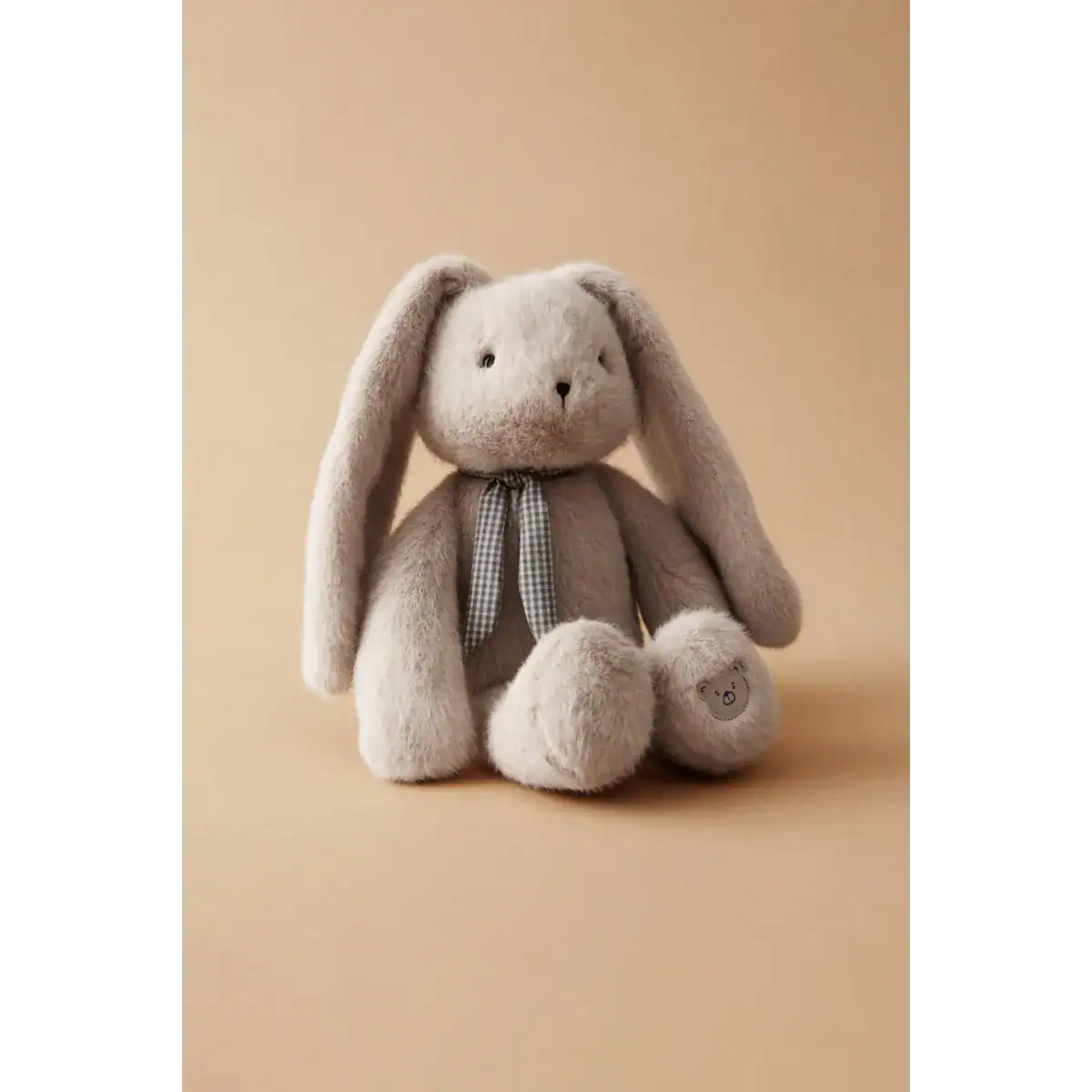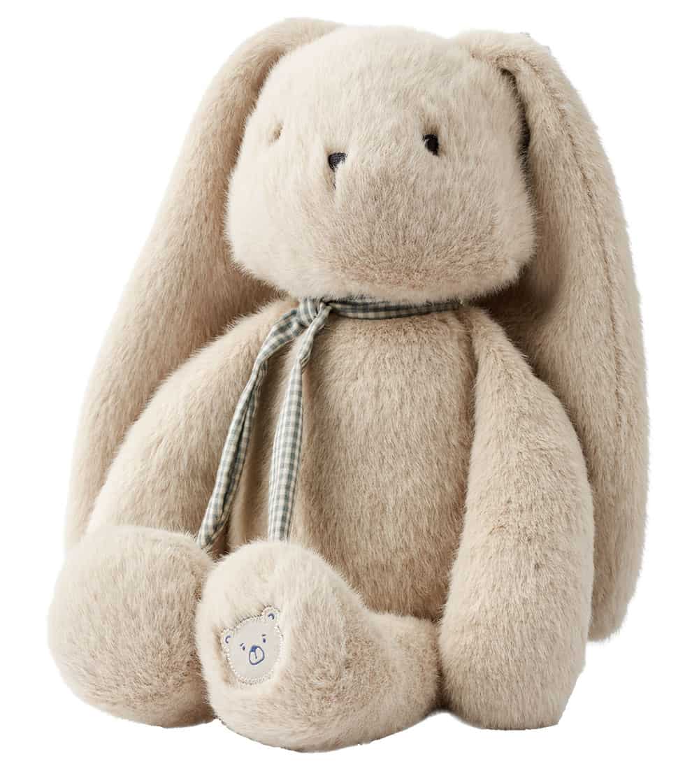 Lindo brinquedo macio da Liewood em formato de coelho, feito de tecido bege com orelhas longas e um cachecol xadrez verde e branco.