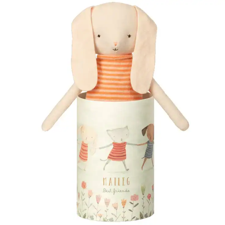 Para um coelhinho, ter um melhor amigo é essencial. É por isso que este coelhinho pulará ansiosamente para fora da linda caixa de presentes para recebê-lo com carinho. Este amável companheiro veste uma charmosa blusa laranja listrada, perfeita para compartilhar momentos de brincadeira e carinho com seus filhos.