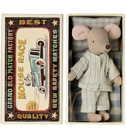 Um item clássico do Maileg. Este mouse está pronto para horas de jogo e dorme bem na caixinha de fósforos. As roupas e lençóis são confeccionados em tecidos macios com estampas exclusivas em lindas cores. Amplie a história adicionando acessórios à peça