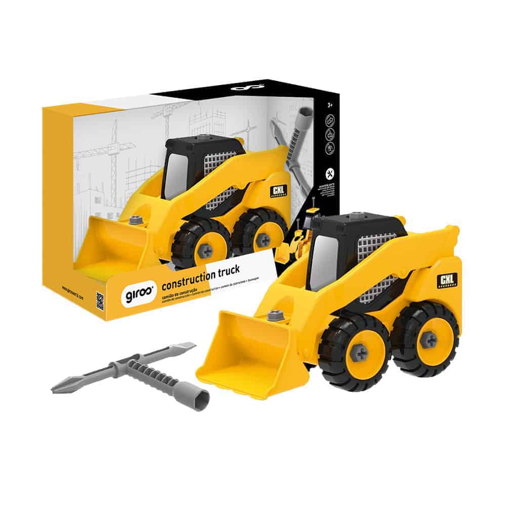 Veículo de construção com luzes e sons alusivos ao universo da construção civil para interação entre a criança e o meio envolvente.