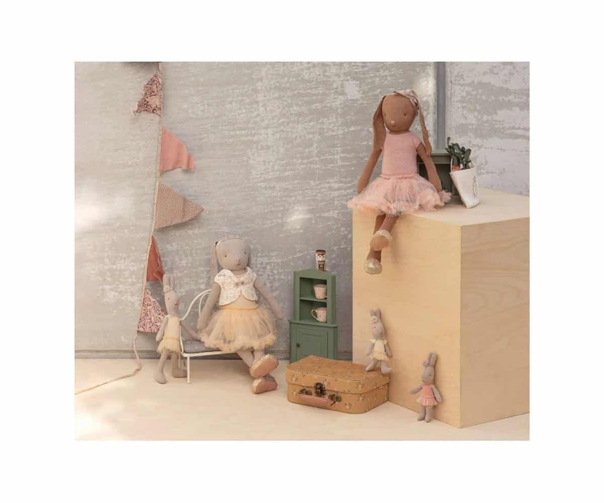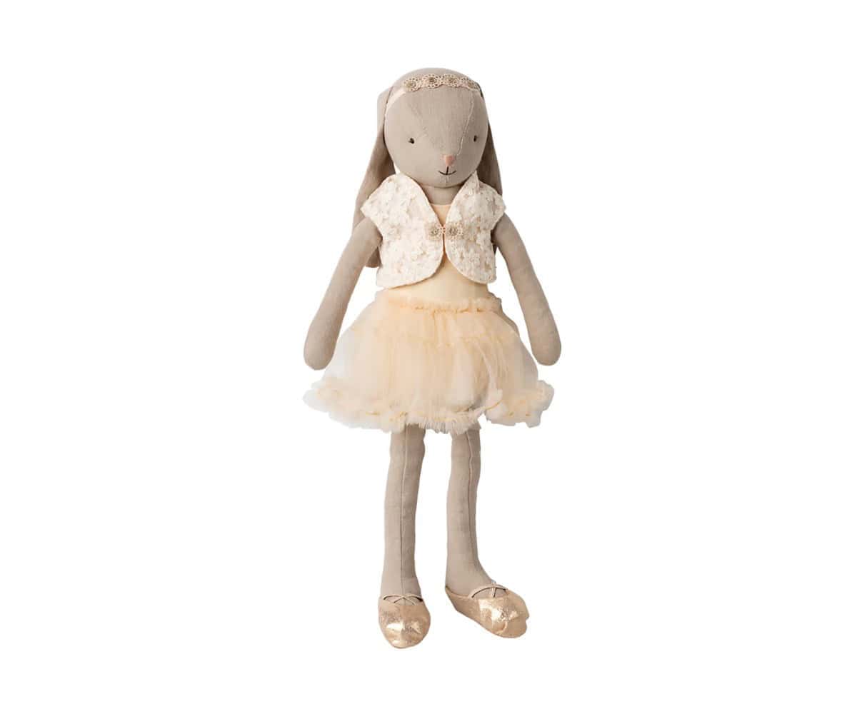 Coelhinha adorável vestida de bailarina por Maileg. O coelho está vestindo um terno de cor creme, saia de tule e sapatos de balé Material: linho Material de acolchoamento: poliéster reciclado, PP