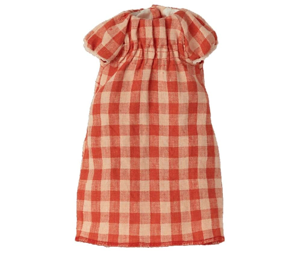 Lindo peluche Maileg em formato de coelho cinza claro com orelhas de abano e vestido xadrez vermelho e rosa.