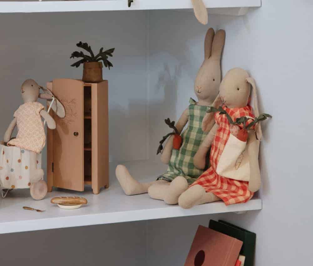 O brinquedo de opeluche Maileg é macio, pode ser usado como uma boneca e as roupas podem ser tiradas e vestidas.