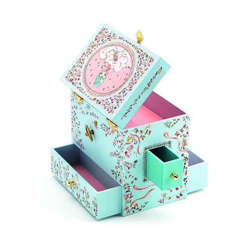 Caixa de jóias musical! Gira a manivela, abre a caixa e ela ganha vida! Em madeira, veludo, plástico e metal.