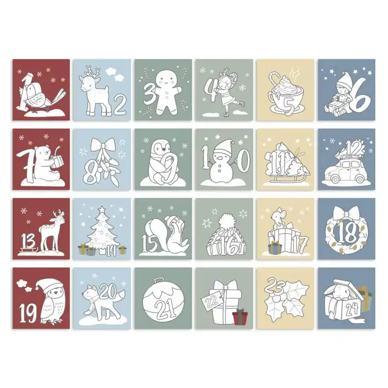 - 24 páginas para colorir: Cada dia revela uma nova página com desenhos únicos para colorir, incluindo um adorável Pai Natal, árvores de Natal cintilantes e bonecos de neve aconchegantes.
