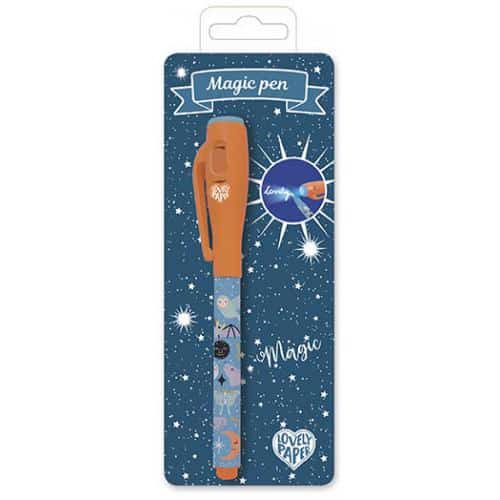 Caneta mágica.Ponta de feltro -13 x 0,5 cm.Tinta invisível que aparece quando se aponta a luz UV com a tampa.Botão ligar/desligar.Funciona com 3 baterias LR44 HD, incluídas.