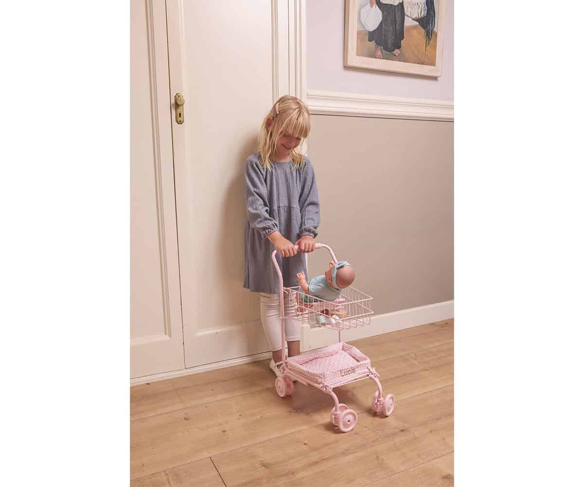 A estrutura robusta em ferro inclui uma cesta superior espaçosa com assento integrado para bonecas, uma bandeja inferior em tecido e rodas dianteiras giratórias que facilitam o manuseio. A alça acolchoada garante conforto extra em cada passeio.