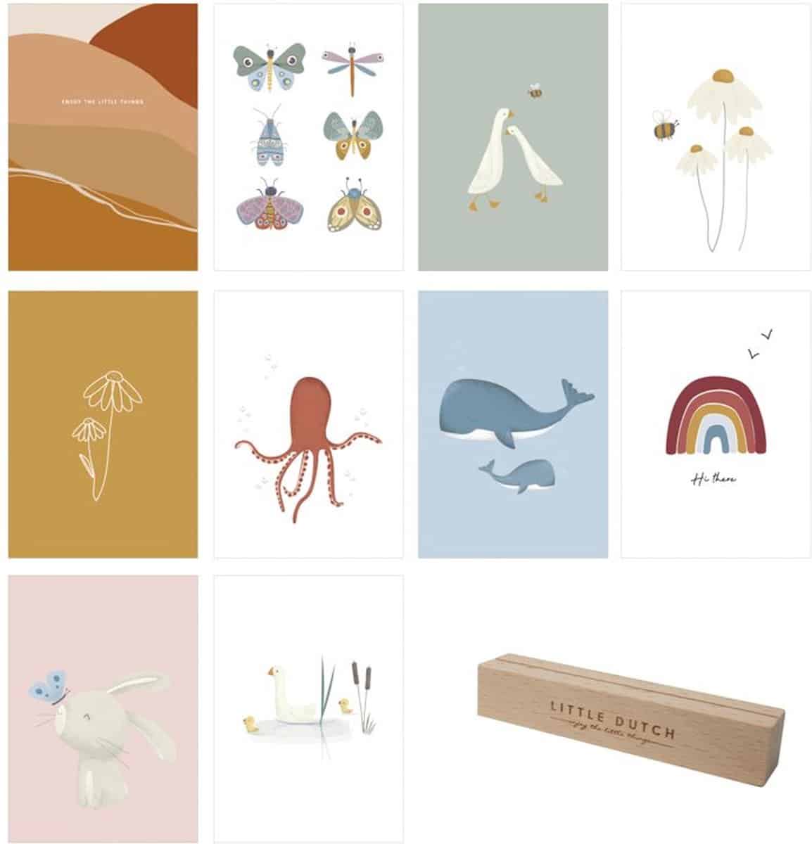 Os dez cartões postais vêm com um porta-cartões de madeira, para que voê possa alegrar o quarto do seu bebé ou da criança com um lindo cartão.
