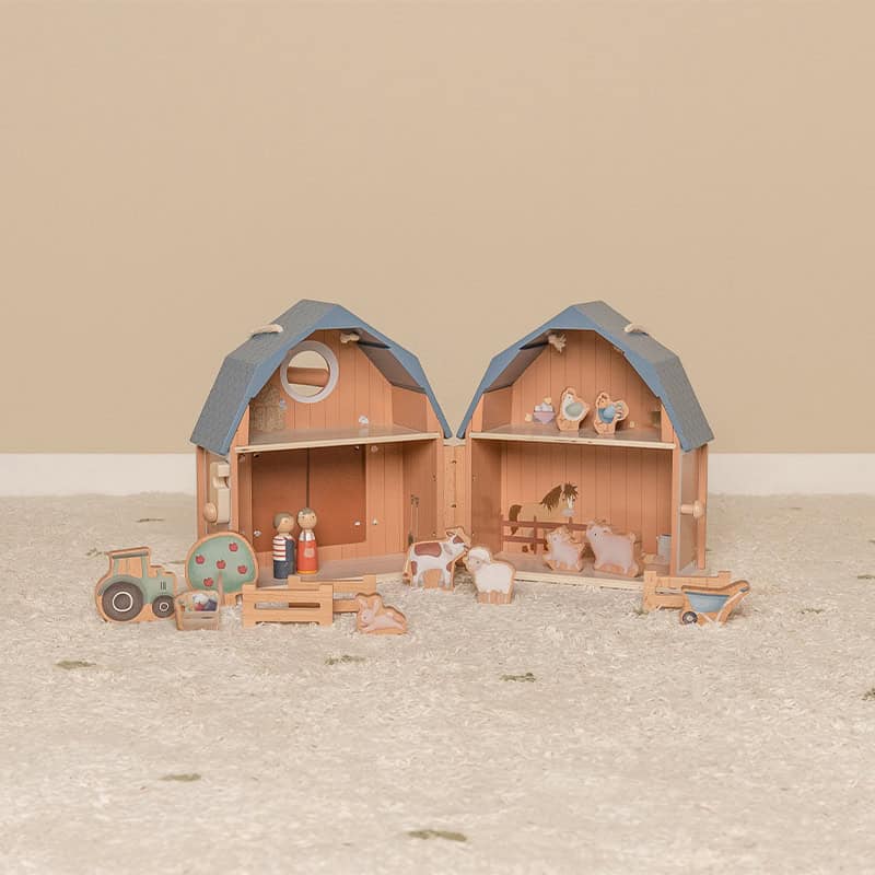Com esta casinha em formato de celeiro que fica na quinta, o seu filho vai se divertir muito! Abra o celeiro e os animais chegarão. Com todas essas figuras de madeira, ele poderá criar a sua própria história, estimulando seu o pensamento imaginativo. E quando a brincadeira acabar, basta guardar todas as figuras dentro da casinha, dobrá-la novamente e arrumá-la.
