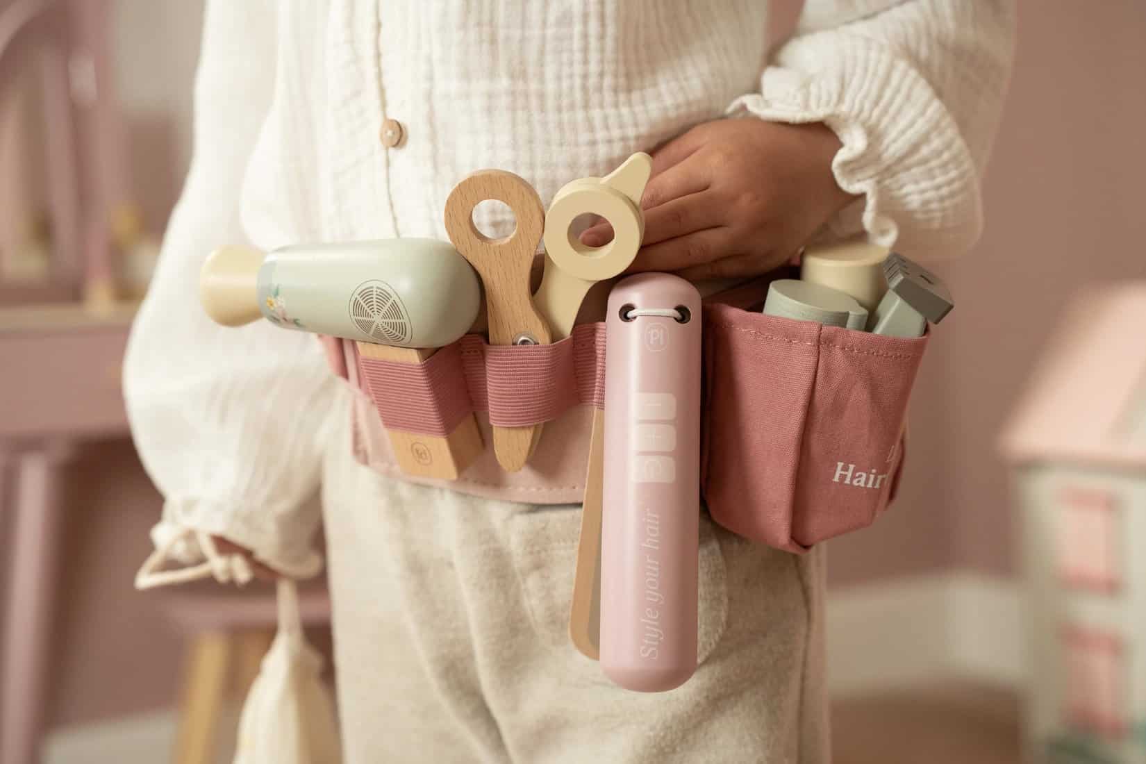 Corte, seque e penteie como um verdadeiro cabeleireiro! Com este lindo conjunto de cabeleireiro em madeira, o seu pequenote tem tudo à mão para criar os mais belos penteados. O cinto ajustável rosa está repleto de acessórios profissionais, como uma tesoura de brincar, um secador de cabelo, uma prancha, uma máquina de cortar cabelo, uma escova, champô, spray de cabelo e um espelho.
