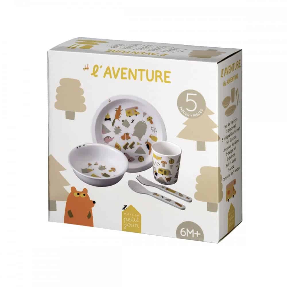 Um lindo conjunto de 5 peças, com bordas ergonômicas para ajudar as crianças a pegar os alimentos e comer quase sozinhas. Um prato, uma tigela, um tímpano e um conjunto de 2 talheres.