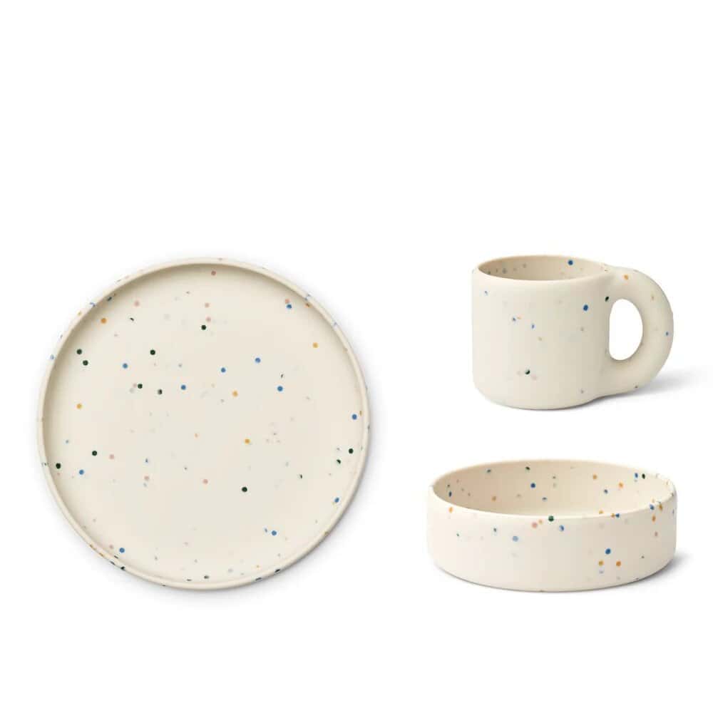 O conjuntode refeição de silicone, é o trio perfeito para pequeno-almoço, almoço e jantar – em casa ou em viagem.Material: 100% siliconeMaterial durável, macio e duradouroLevePode ser lavado na máquina de lavar louça até 60 °C