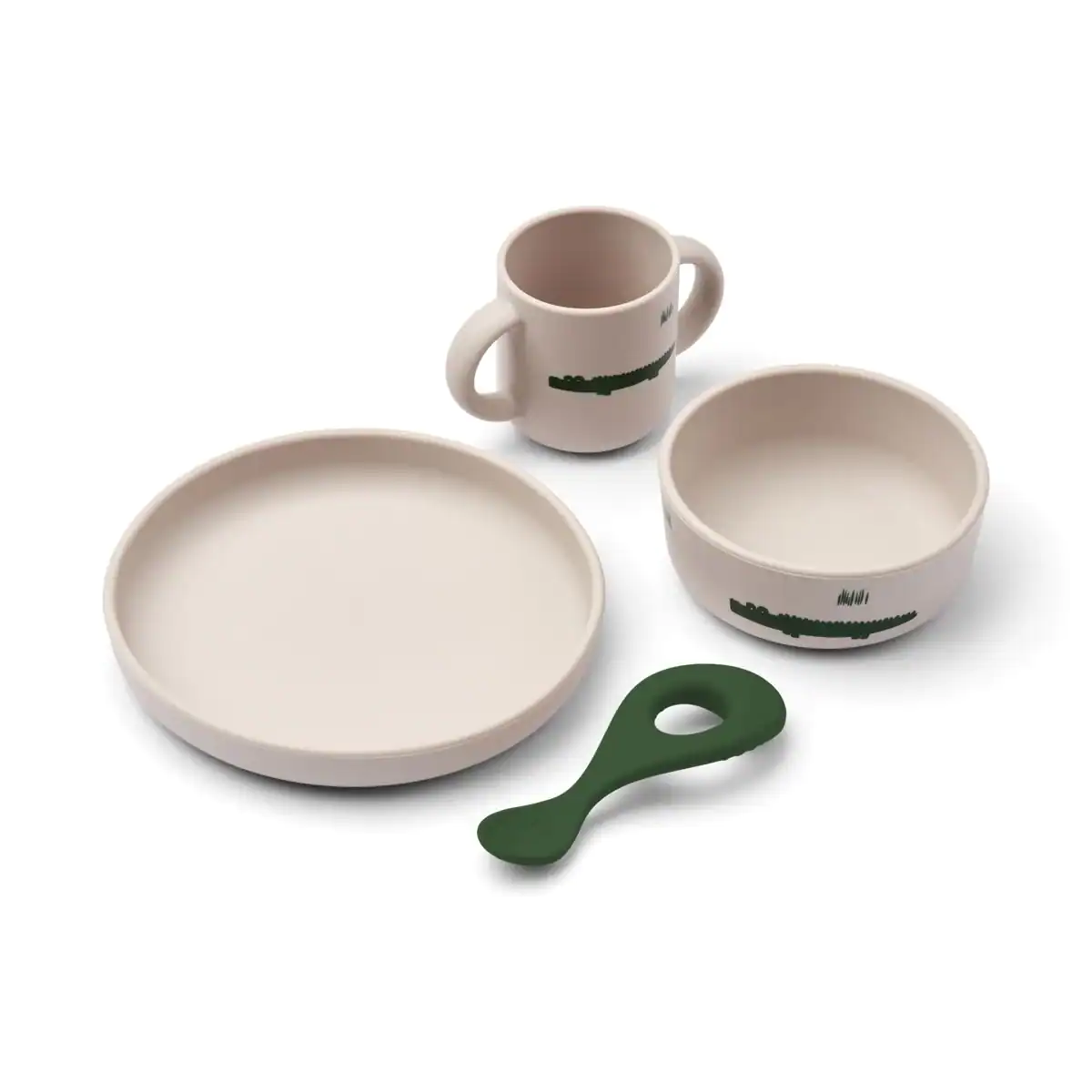 Conjunto prático com tudo o que precisa para os mais pequenos. Feito de silicone durável e de alta qualidade, o conjunto de utensílios de mesa é à prova de quebra e pode ser lavado na máquina de lavar louças.