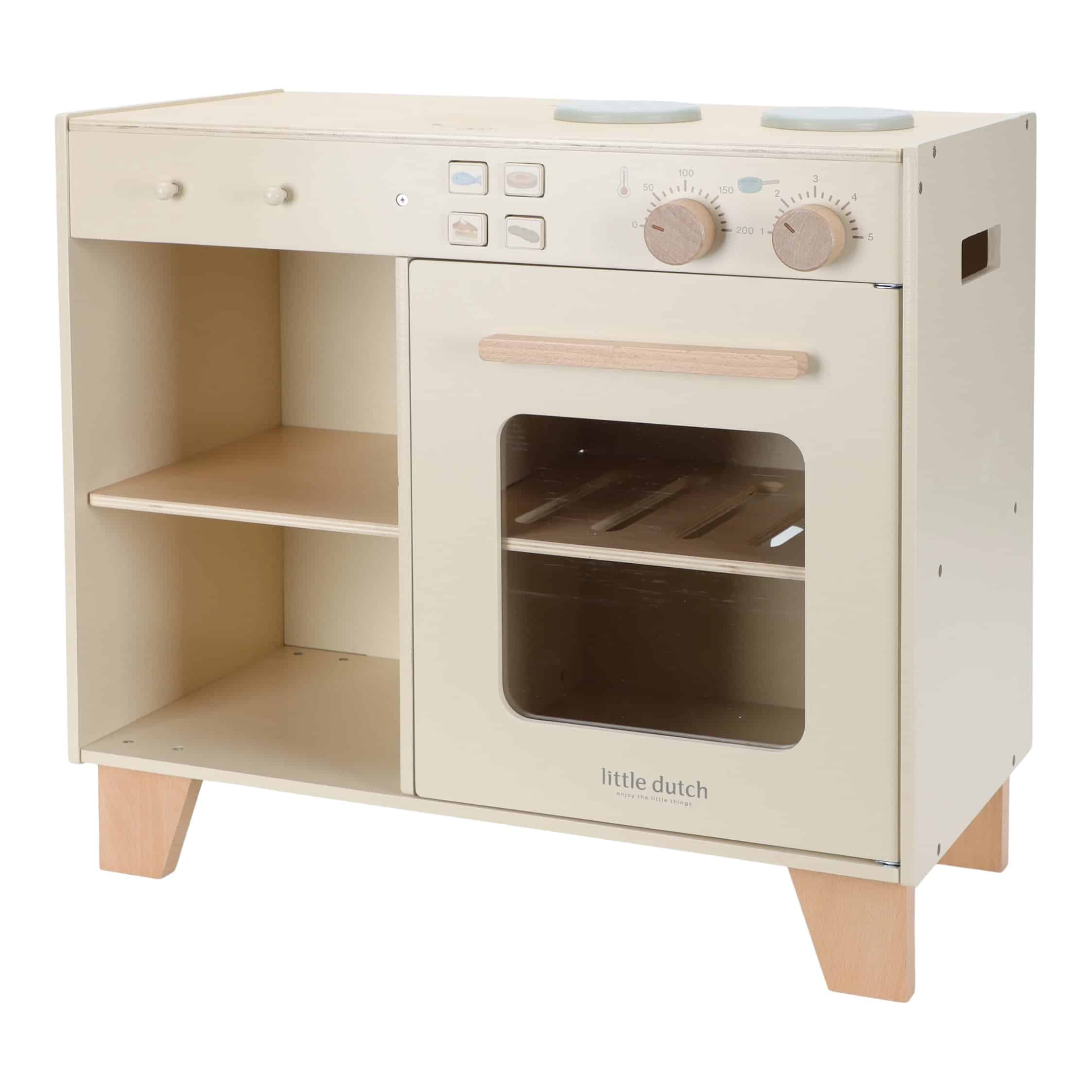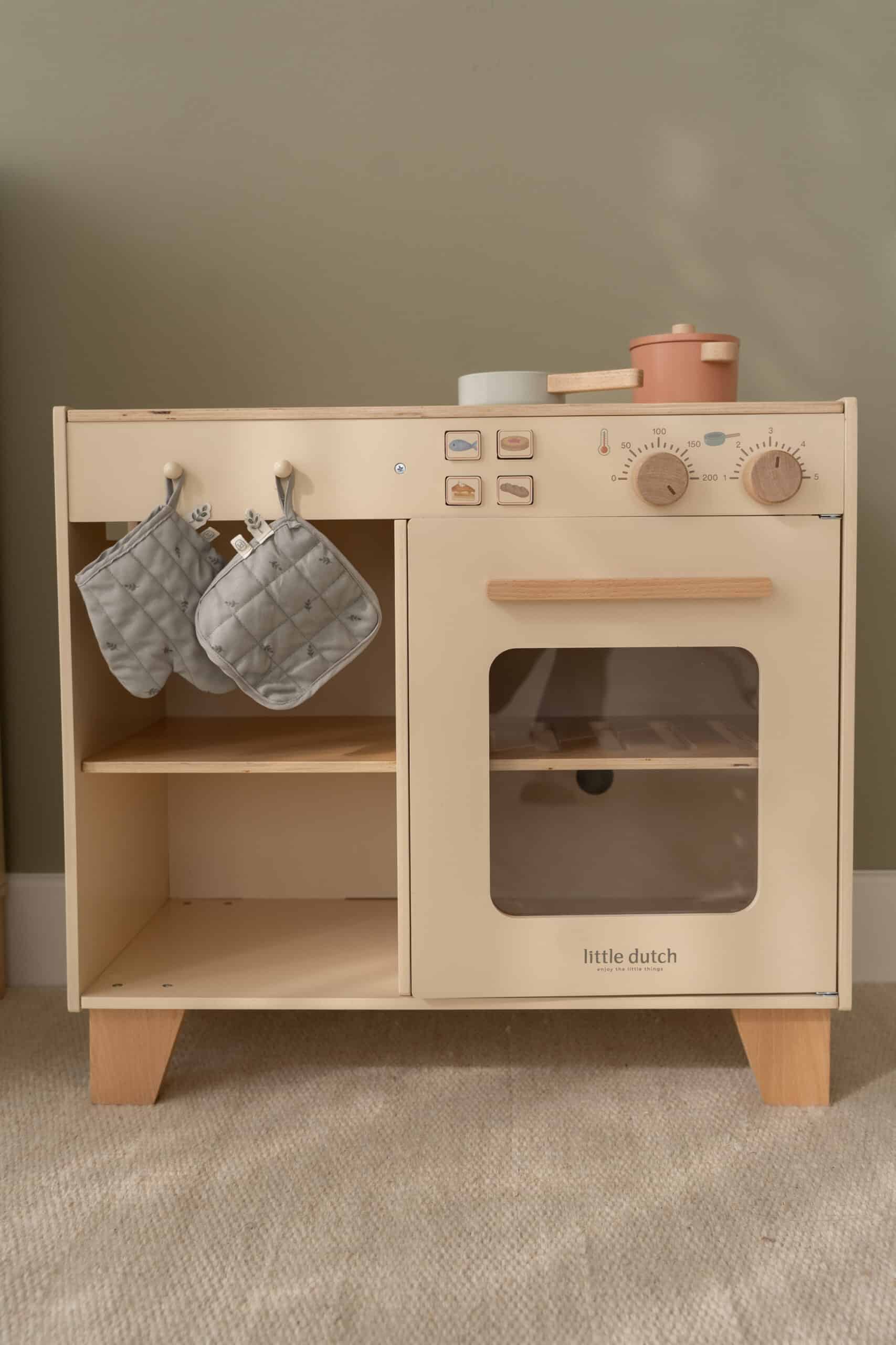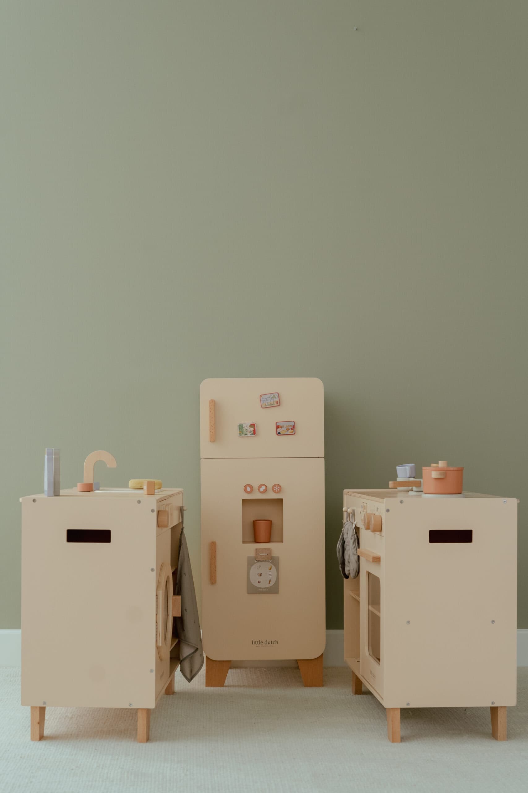 Pequenos chefs, atenção! Esta linda cozinha de madeira é perfeita para preparar os pratos mais deliciosos. Fazer um bolo no forno ou cozinhar legumes frescos no fogão. O conjunto inclui duas panelas, uma pega de panelas e uma parede para o forno, além de botões com ilustrações para maior realismo. Combine a cozinha com com o frigorífico e a máquina de lavar, para criar uma cozinha completa.