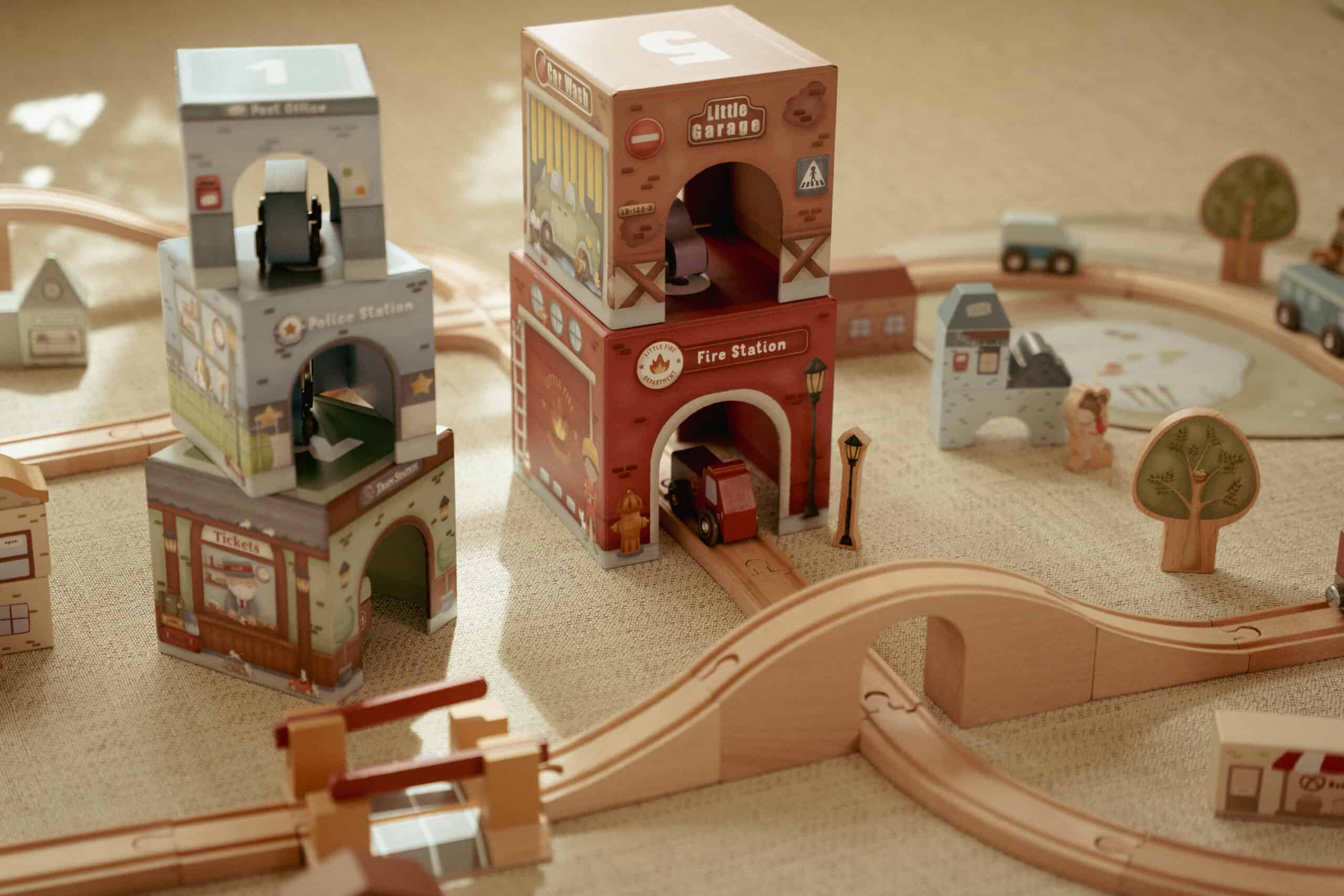 Empilhe os blocos uns sobre os outros ou coloque-os sobre o Trilho XL do Trem Little Dutch, para que os veículos possam passar por baixo sem esforço.