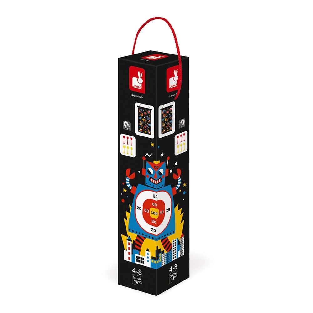Graças ao cordão, é fácil de pendurar e guardar na caixa enrolando-o. As crianças podem também experimentar a emoção da competição. Com esta versão, mergulhe no mundo dos robots e tente alcançar 100 pontos usando habilidade e destreza! Este alvo magnético para dardos oferece dois níveis de dificuldade: um lado apresenta um robot gigante invadindo a Terra, enquanto o outro, mais desafiador, retrata naves espaciais e planetas espalhados para acertar usando os seis dardos incluídos.