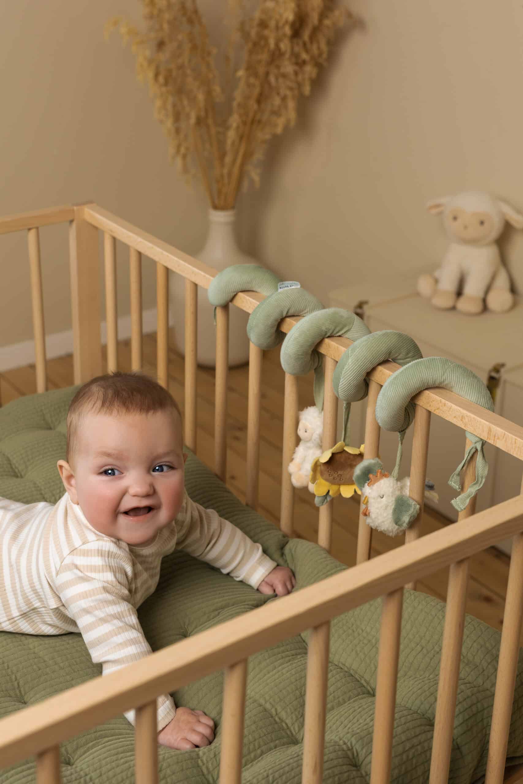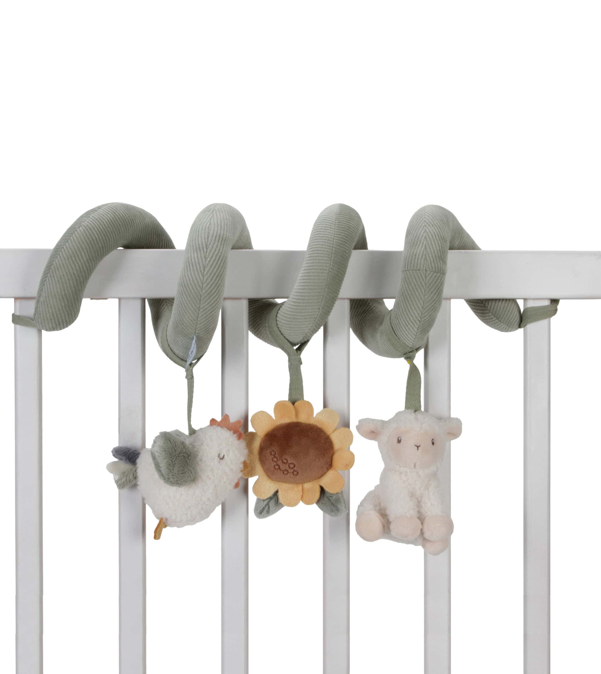 Espiral de Atividades Little Farm: estimula os sentidos do bebé com texturas variadas. Ideal para berços, cercadinhos e assentos de carro.