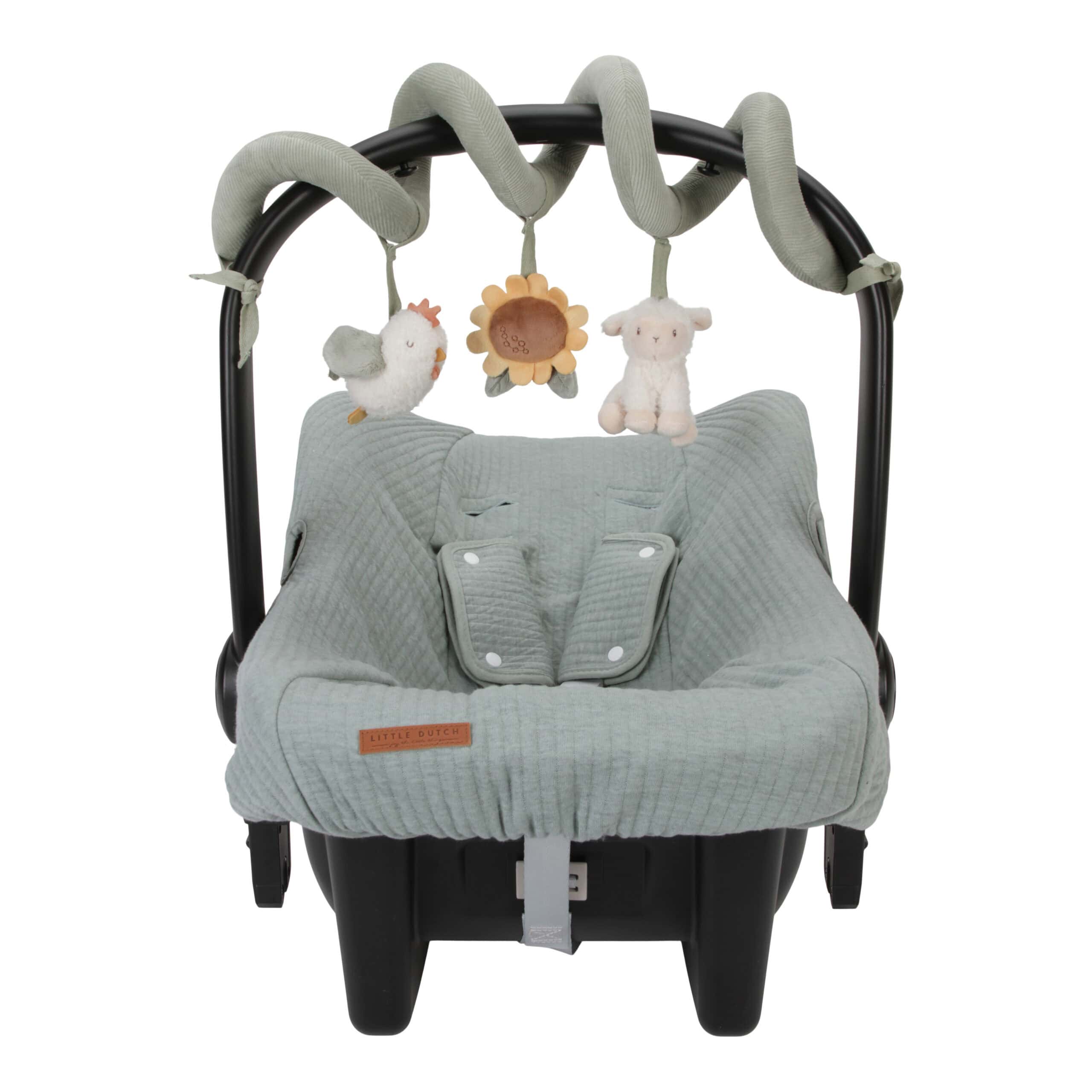 Esta espiral com actividades divertidas manterá os bebés ocupados em casa e em viagem. Prende facilmente este brinquedo prático a qualquer coisa, desde um berço até a um carrinho ou ovinho de carro. Esta Espiral Fortalece os sentidos e estimula a coordenação olho-mão. A espiral de atividades é feita de veludo cotelê com algodão e traz uma ovelhinha, uma galinha alegre e um lindo girassol.