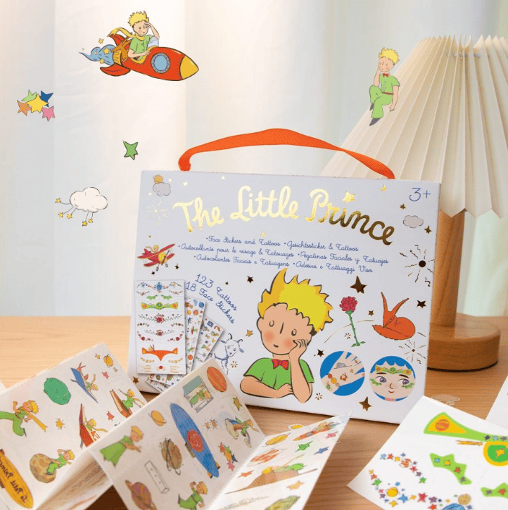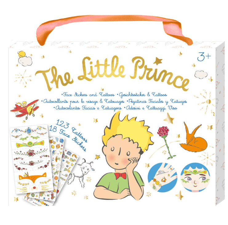 Faça uma criança — ou qualquer fã de O Pequeno Príncipe — feliz com esta adorável caixa de presente, em formato de mala com alça. Lá dentro, encontrará uma grande variedade de tatuagens temporárias e adesivos faciais coloridos com motivos do adorado universo. A caixa contém 18 adesivos faciais e 123 tatuagens temporárias , todos fáceis de aplicar.