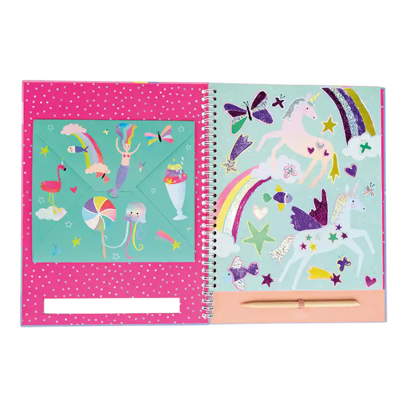 Inclui 20 folhas de alumínio de diferentes cores, 8 páginas e um lápis óptico de madeira, tudo em um prático caderno espiral.