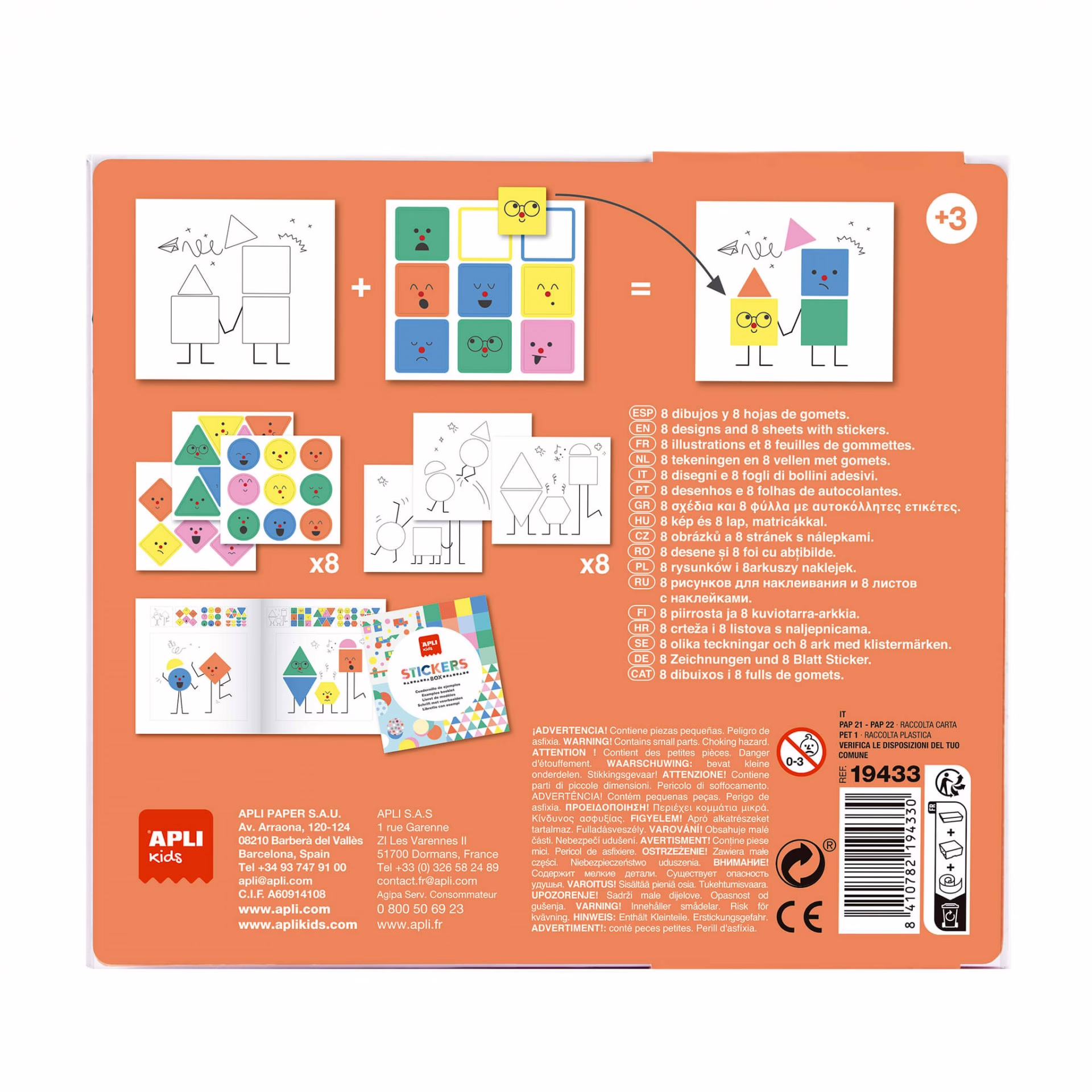 O jogo inclui: 8 cartas ilustradas, 8 folhas com adesivos educativos removíveis e 1 guia de exemplo colorido. Os adesivos removíveis permitem que a criança corrija se cometer um erro.