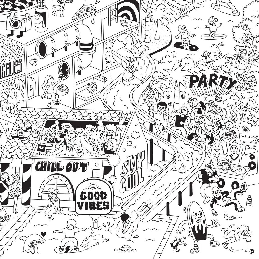 Junte-se ao mundo incrível dos skatistas e surfistas da Costa Oeste com este póster gigante para colorir!
