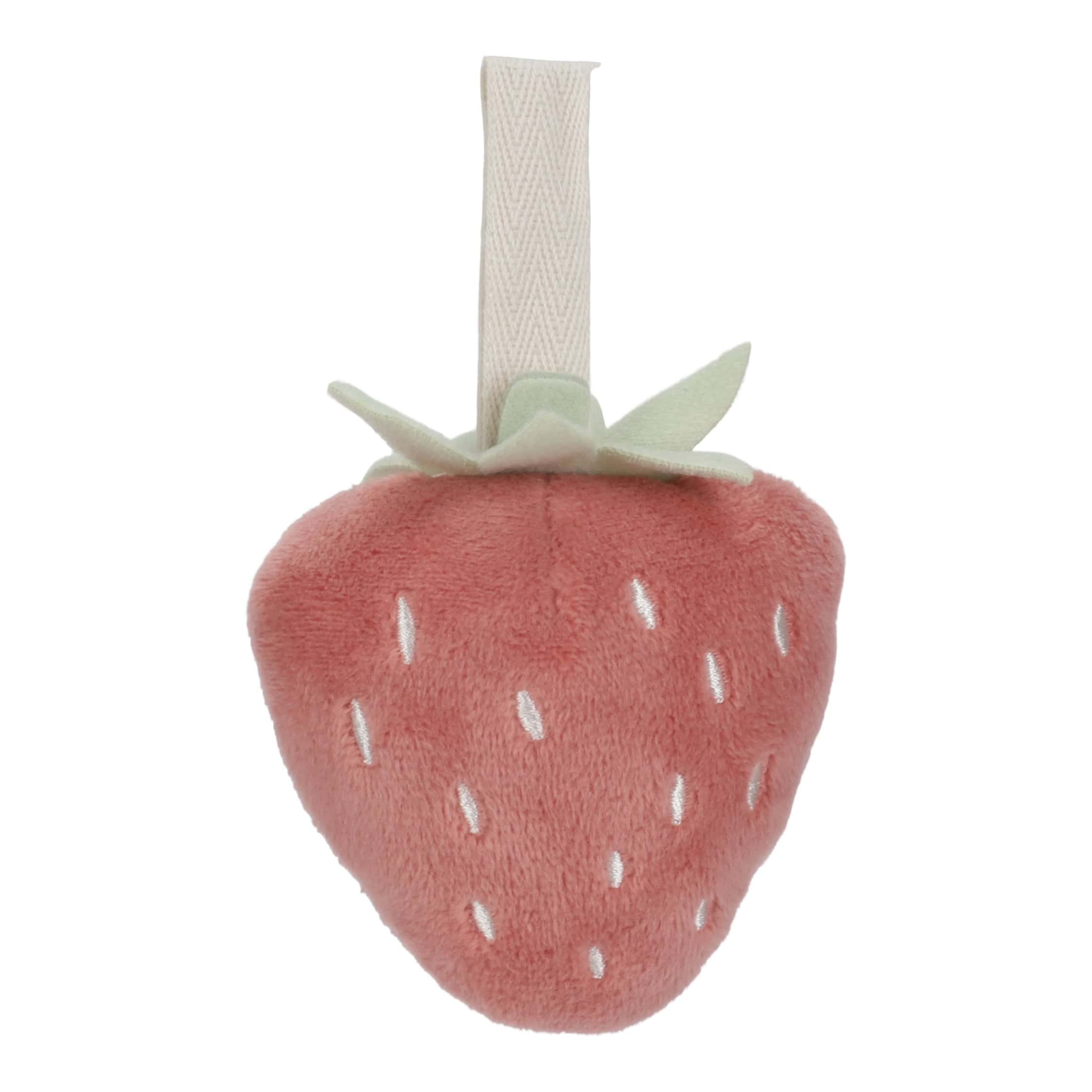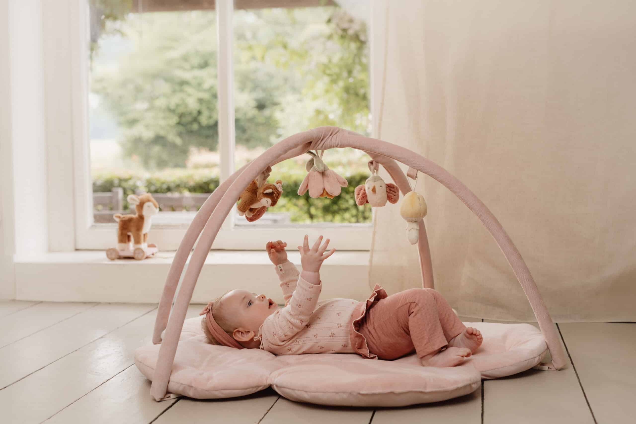 O tapete rosa possui dois grandes arcos de veludo cotelê dos quais pendem cinco brinquedos de pelúcia diferentes da coleção Jardim das Fadas. O adorável cervo, o pássaro, o cogumelo, a flor e o morango ajudam a criança a desenvolver habilidades sensoriais e a estimular a coordenação motora.