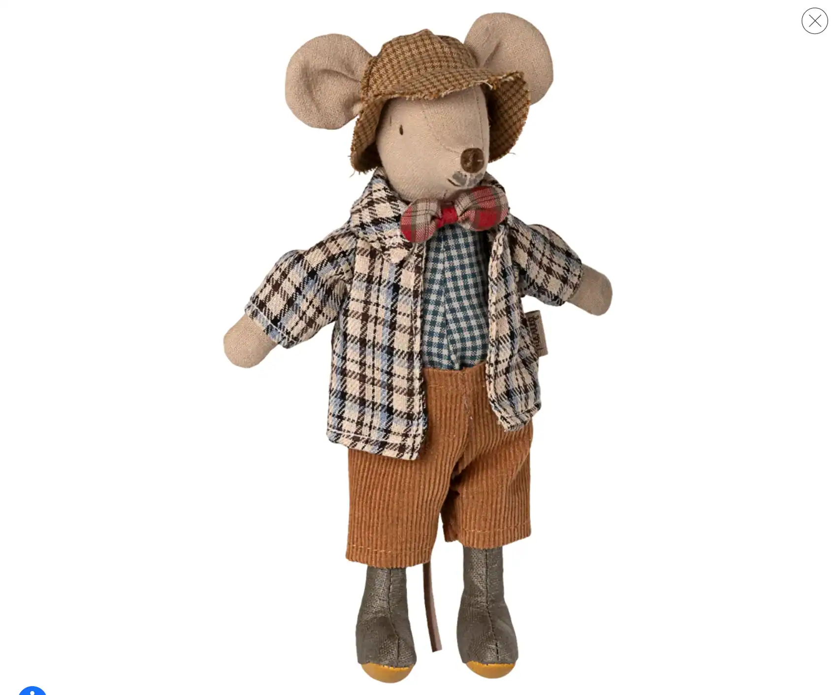 Rato da Maileg com um casaco xadrez, chapéu, calças de veludo cotelê castanho e um laço xadrez vermelha.