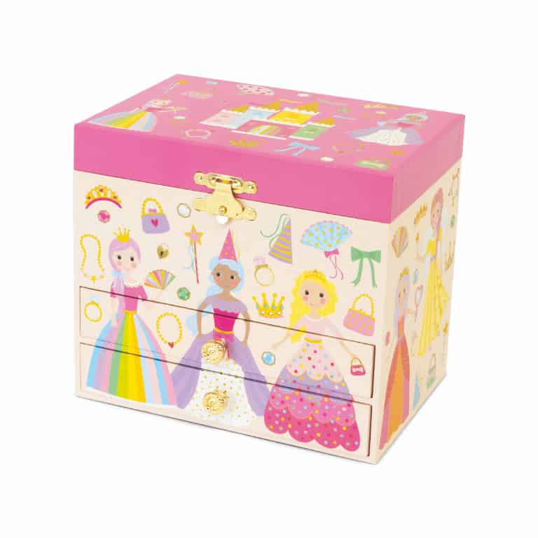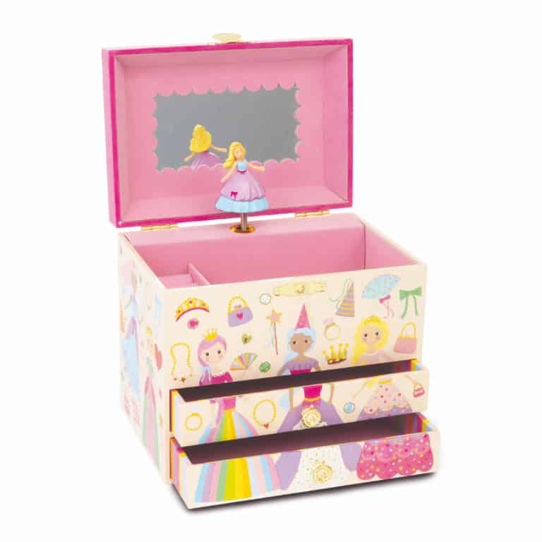 Esta Caixa de Joias Musical é digna de uma princesa! Coberta com lindas princesas e detalhes brilhantes em papel alumínio, gire o enrolador na parte de trás para ouvir a “valsa carrossel” enquanto a princesa gira dentro dela.