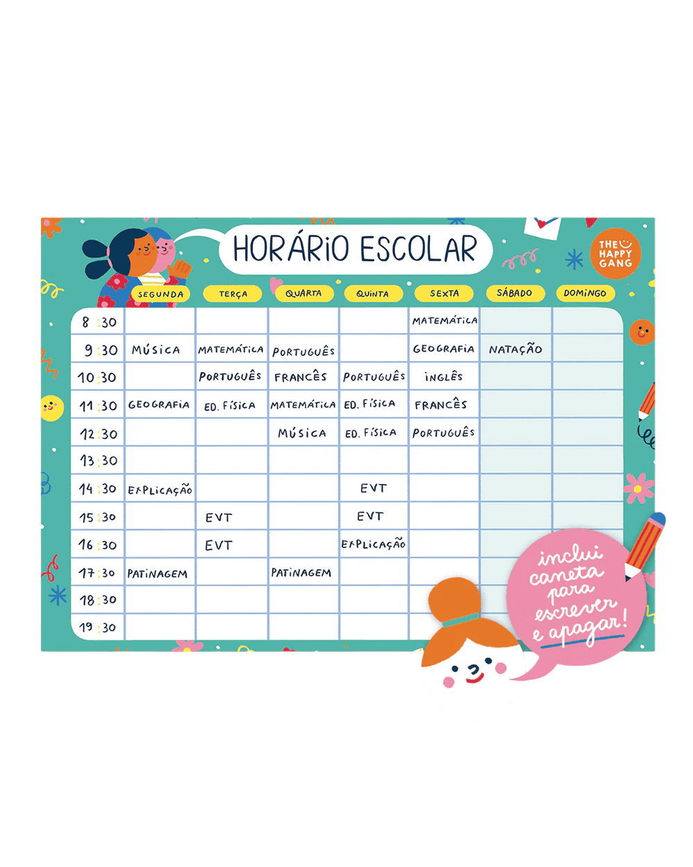 Horário escolar magnético com 22×15,5cm. Ideal para escrever o horário e todas as atividades extra que tens durante toda a semana! Incluí uma caneta para escrever.