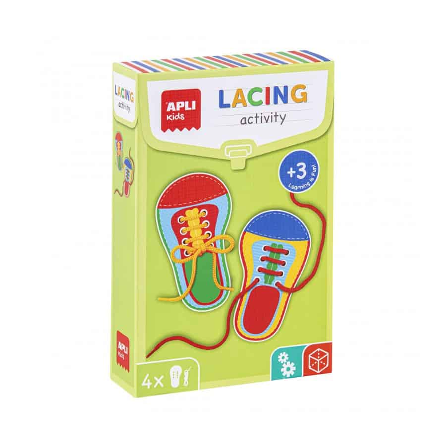 Jogo para aprender a atar os sapatos. Cada jogo contém 4 cartas (2 pares) de 95 x 165 mm em formato de sapato e 4 atacadores de cores diferentes. Inclui uma folha de instruções.