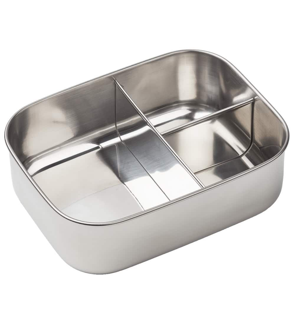 A lancheira Liewood é feita de aço inoxidável, o que a torna resistente e impede que ela se deforme, mantendo o seu formato. A lancheira possui uma tampa de silicone, facilitando a abertura e o fecho. Internamente, é dividida em dois compartimentos pequenos e um grande.