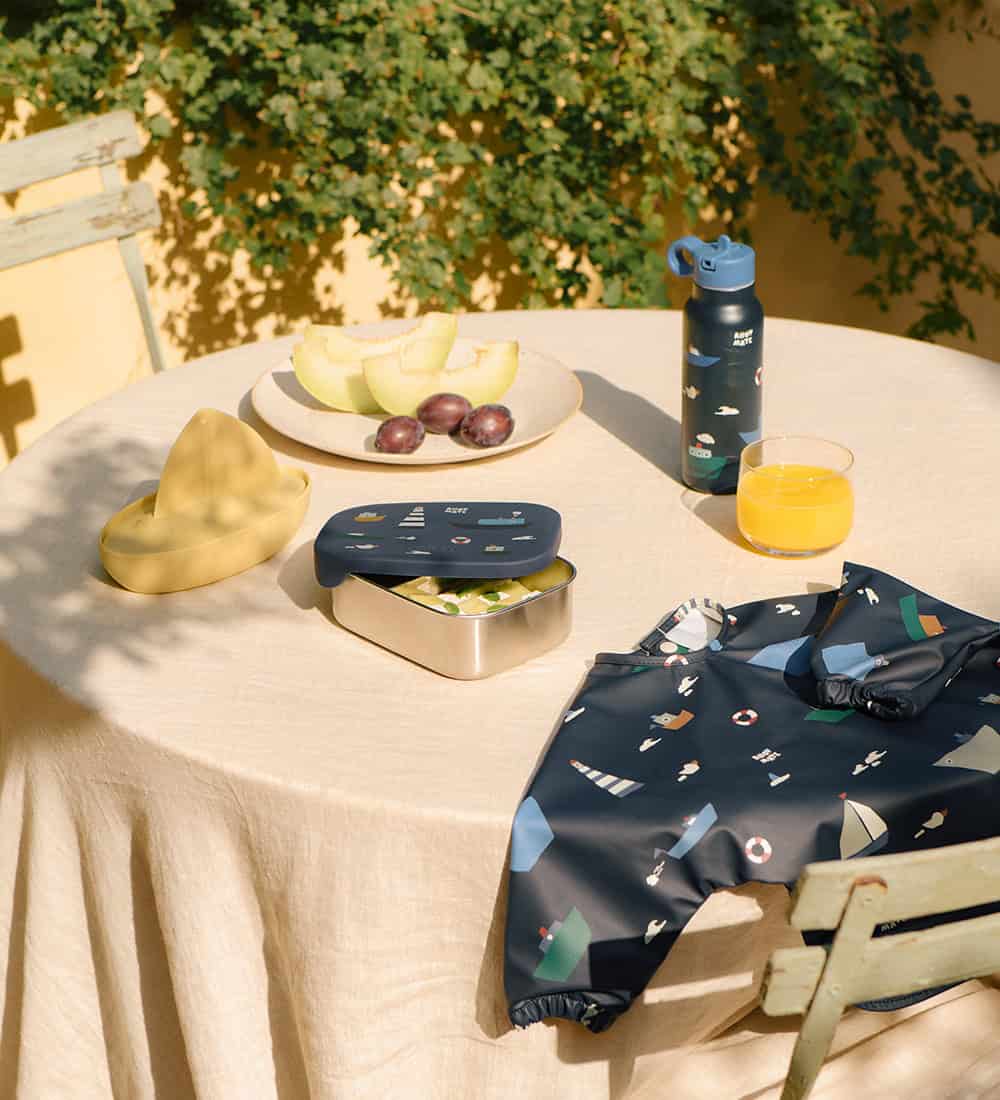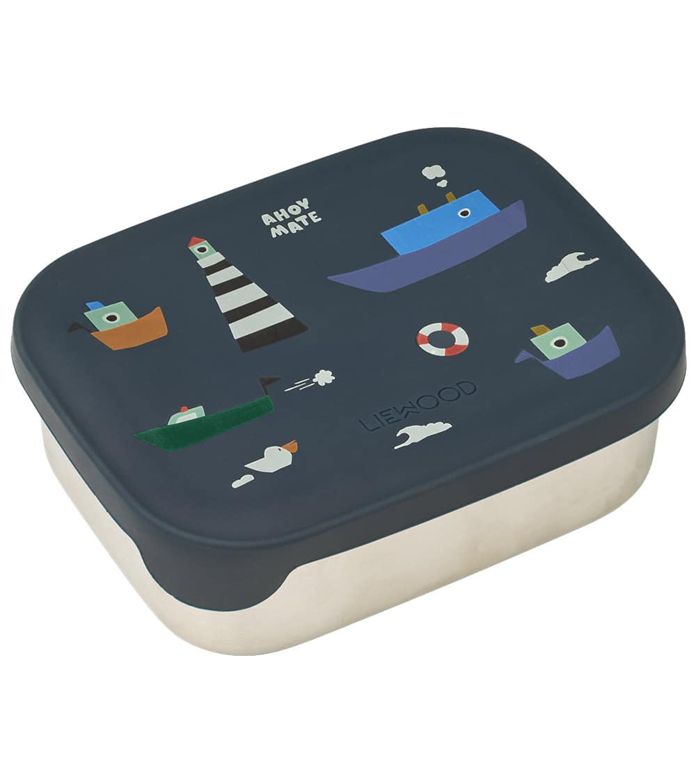 Lancheira Liewood em aço inoxidável com tampa de silicone azul-marinho, que possui um estampado náutico.