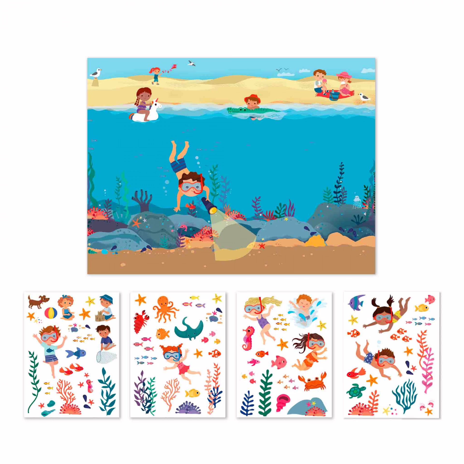 Jogo de adesivos removíveis com tema de oceano. O jogo consiste em preencher o cenário com o adesivo do mesmo tema.