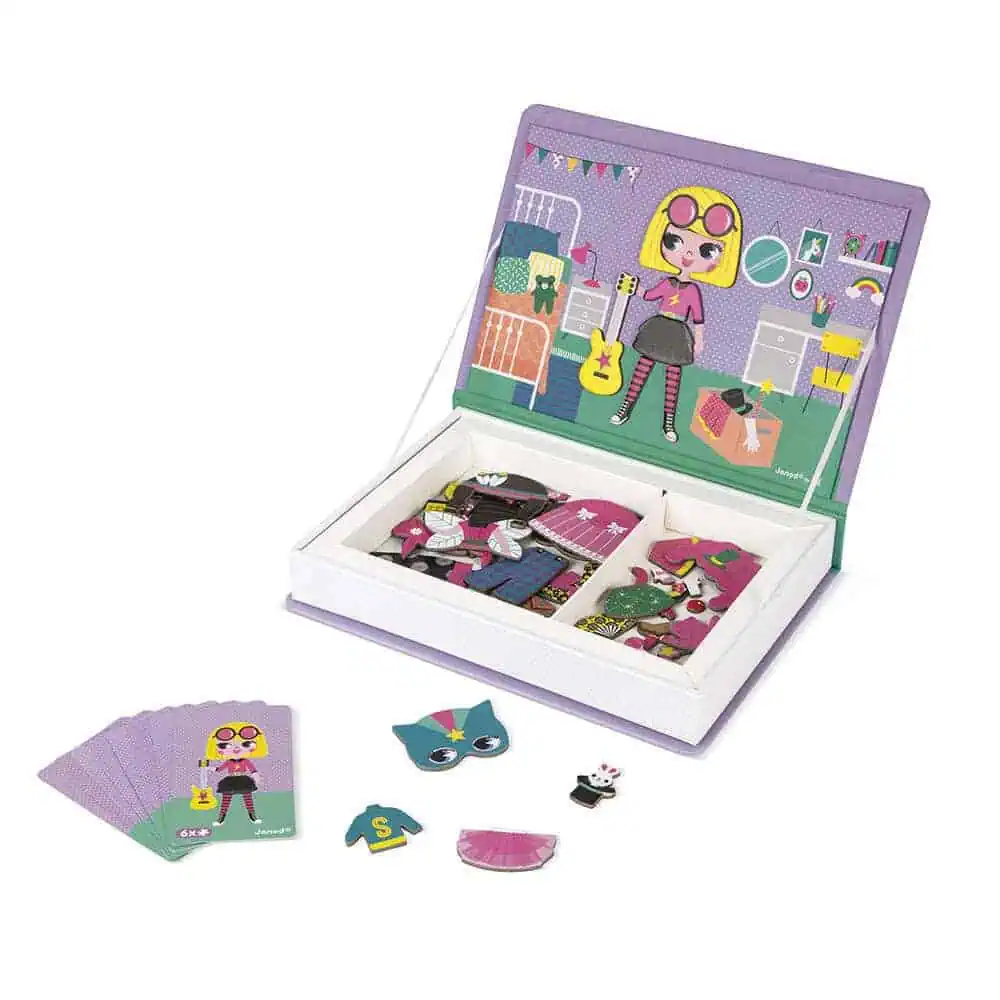 Jogo educativo magnético em cartão para meninas com o tema de vestuário. Composto por 46 ímanes e 8 cartas. Depois de abrir o livro, o objetivo é criar no palco o mesmo look indicado na carta, utilizando os ímanes.