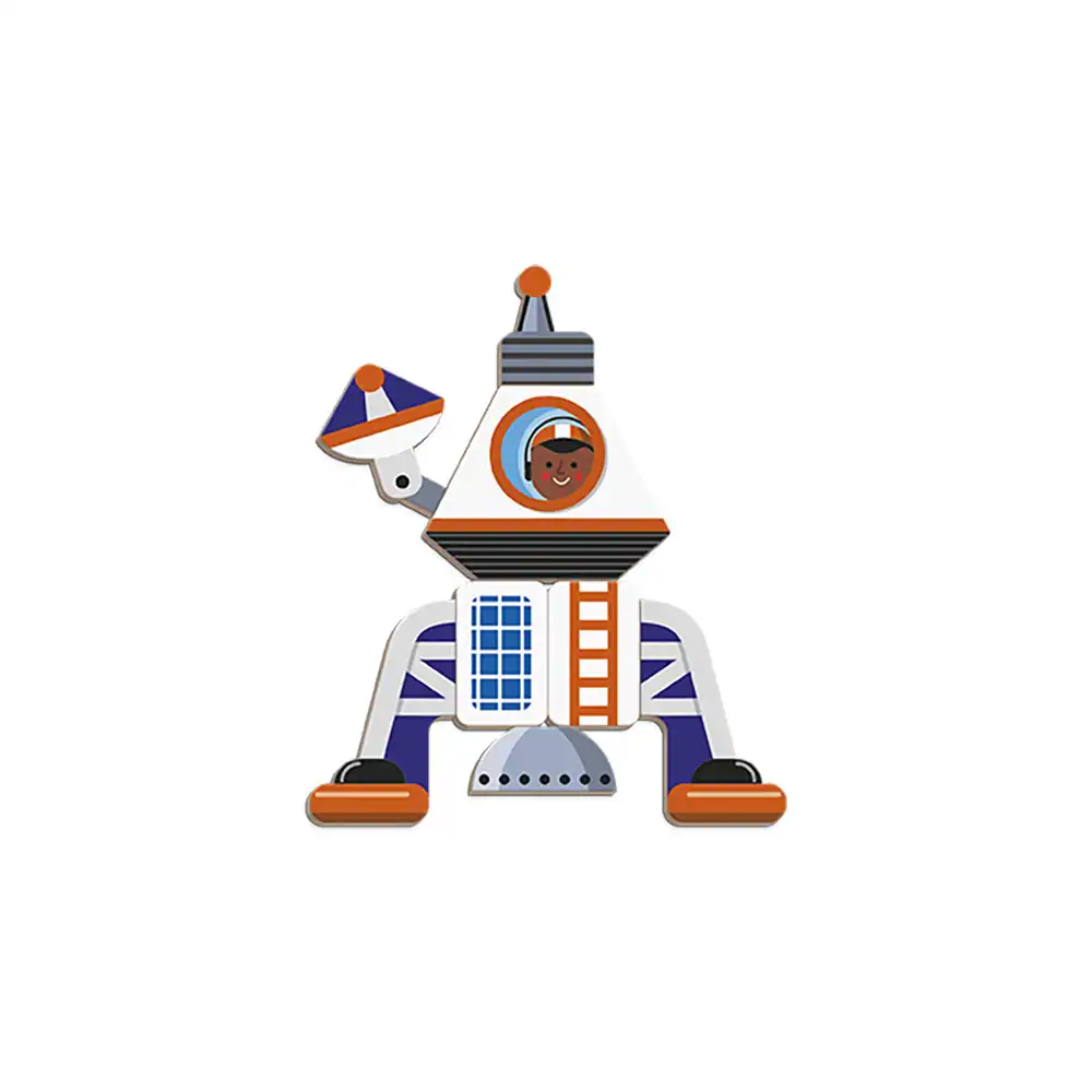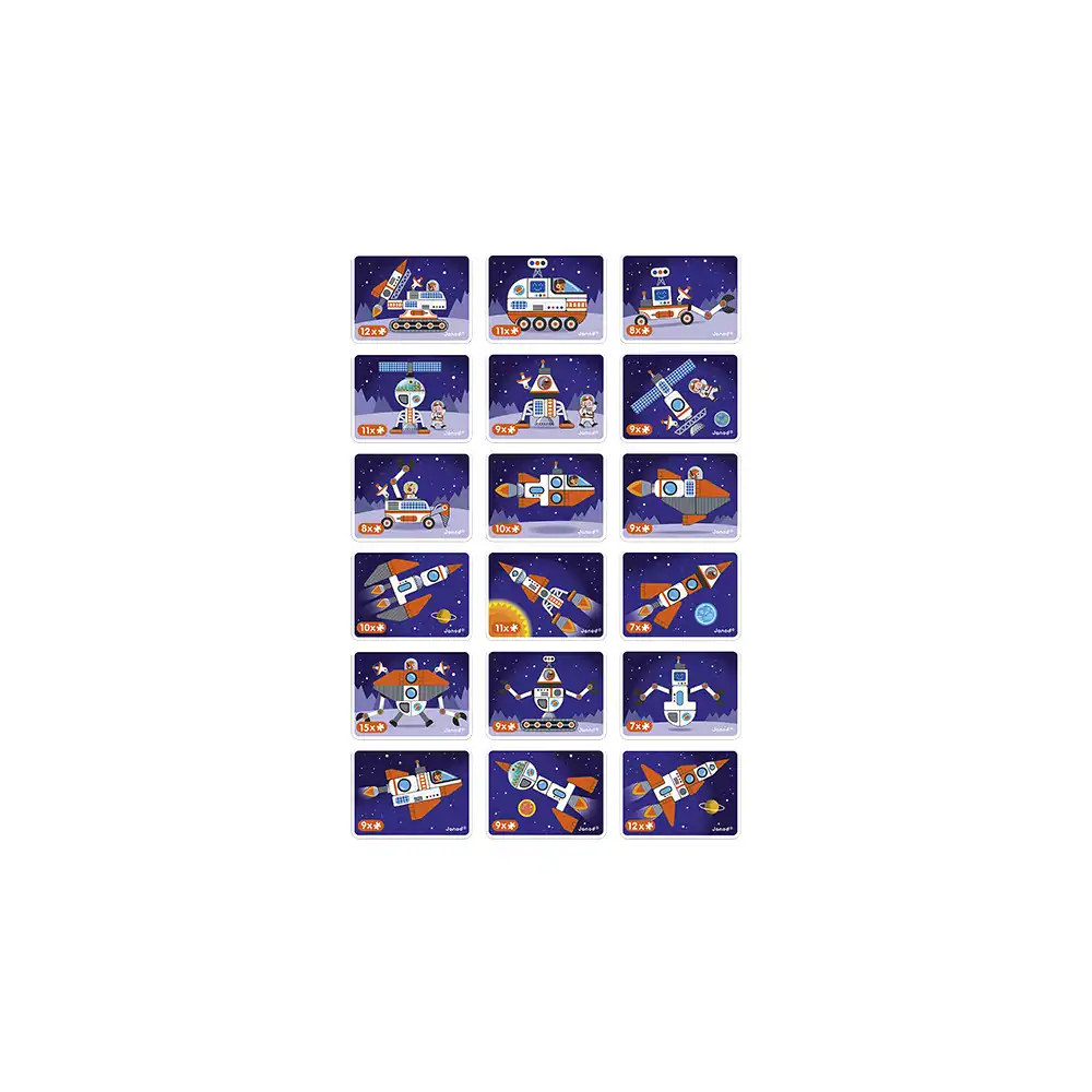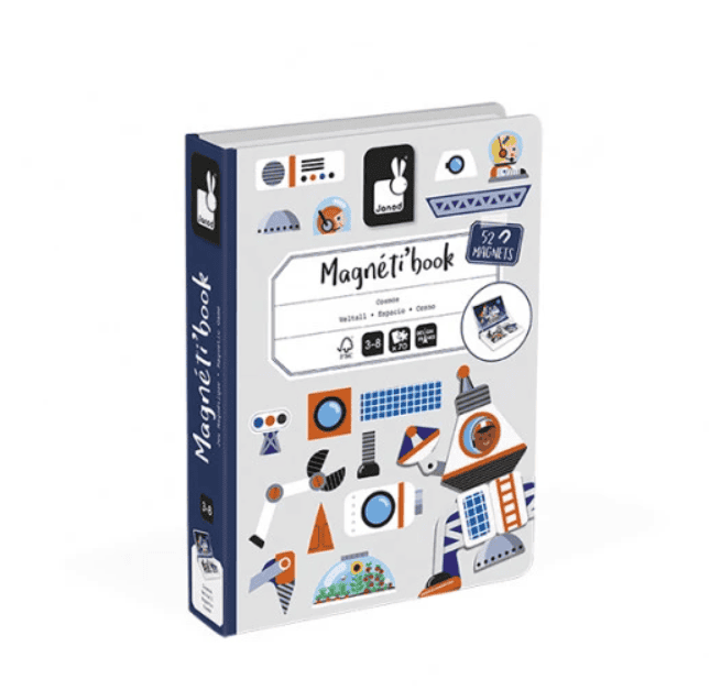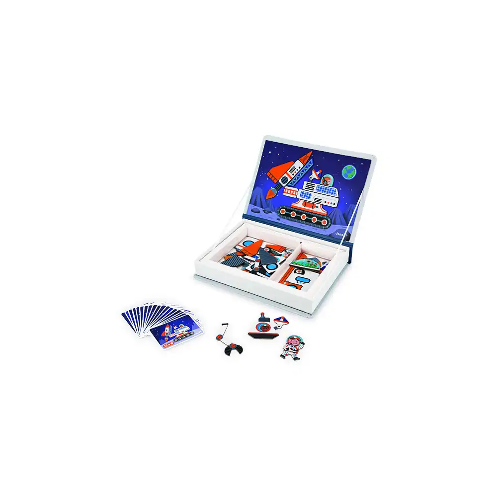 Esta caixa magnética inclui diversos itens magnéticos para as crianças montarem, seguindo os modelos ou da maneira que preferirem! Este jogo de papelão permite que os pequenos a partir de 3 anos descubram os mistérios do nosso universo e dos planetas com seus 52 ímãs e 18 cartas. Lá dentro, pode usar o tabuleiro magnético para construir a imagem da nave espacial mostrada em cada carta, usando os ímãs fornecidos.