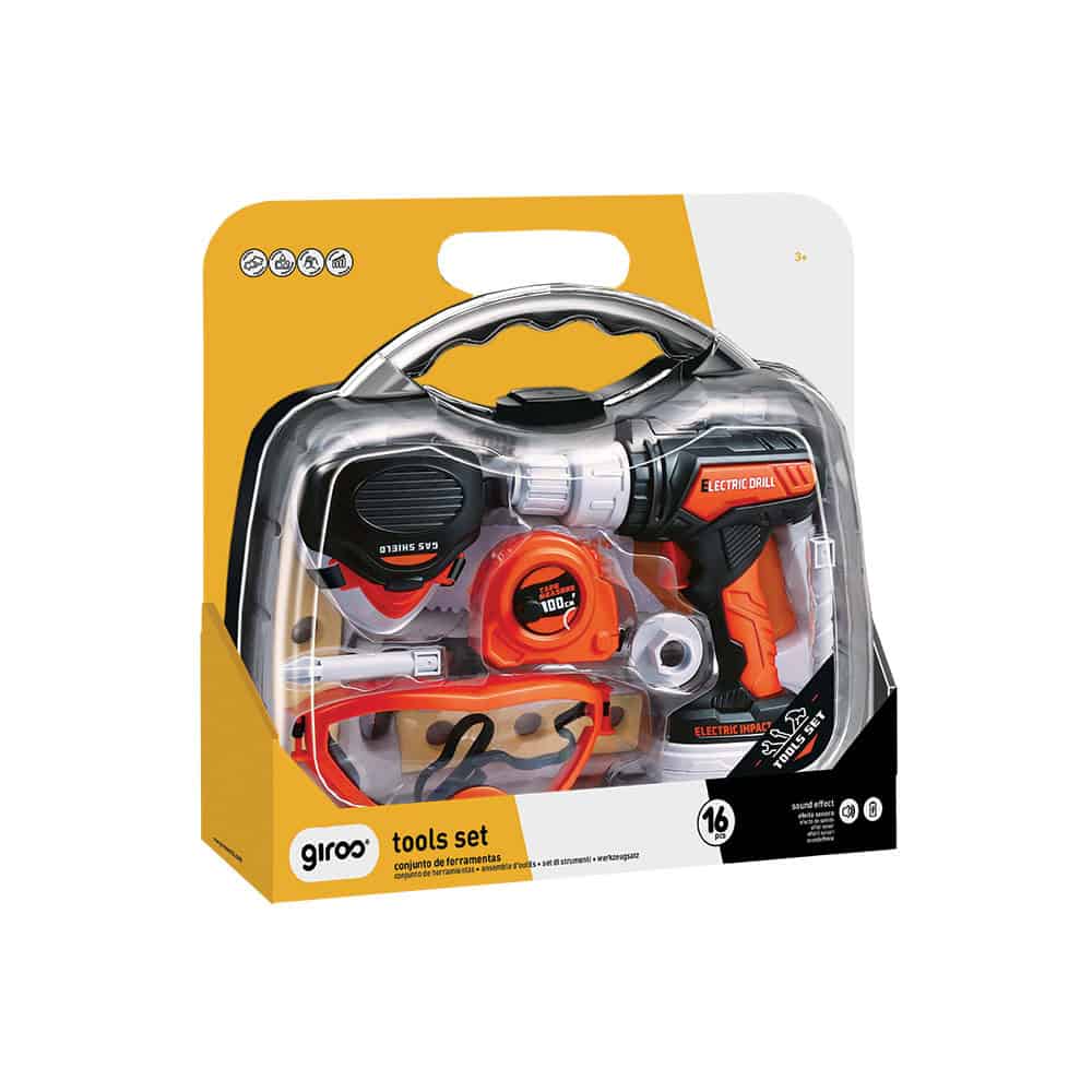 Mala de Ferramentas com 16 peças: mala, berbequim elétrico, óculos de proteção, serrote, fita métrica, régua, máscara, 2 barras perfuradas, 2 parafusos, 2 porcas, 2 ponteiras.